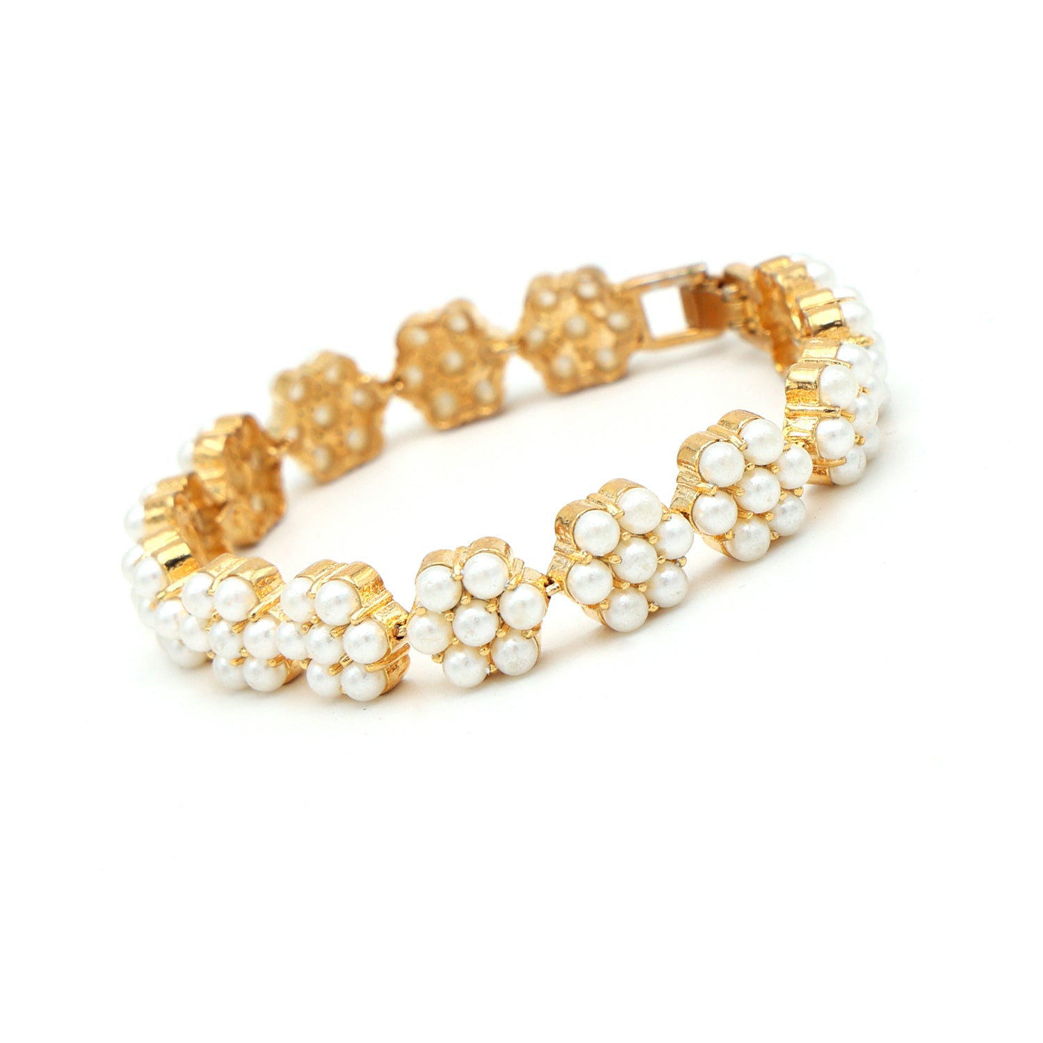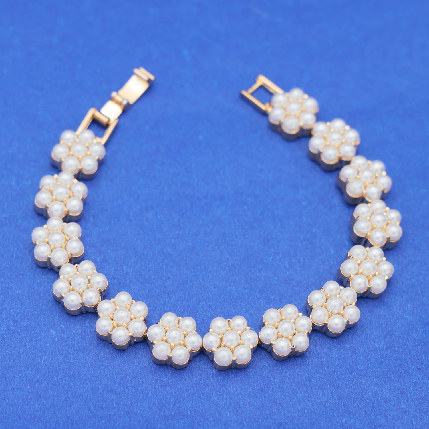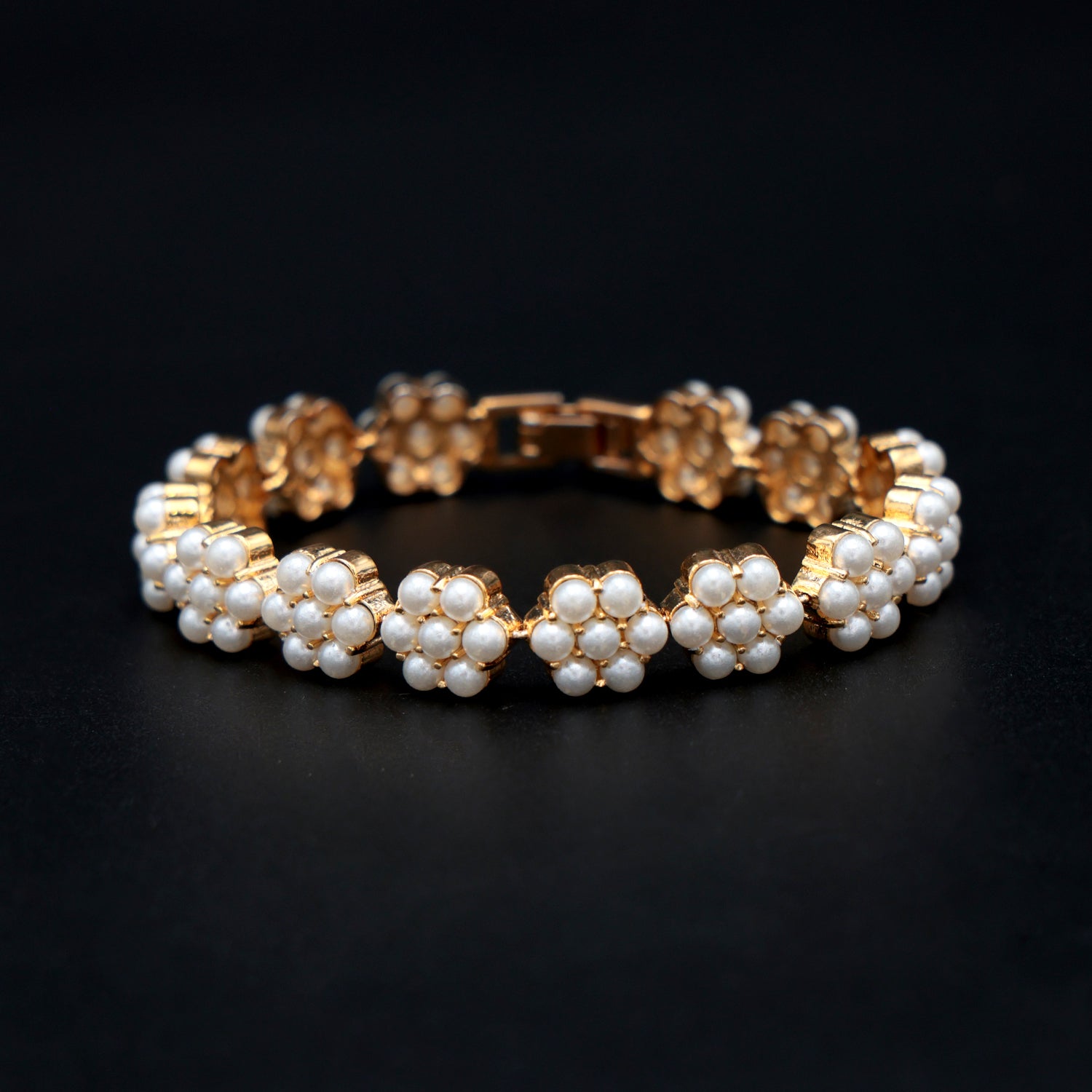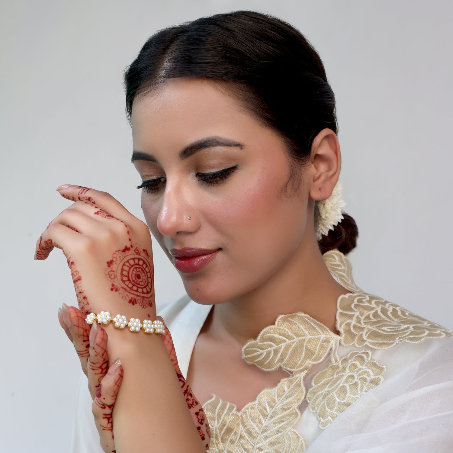 A delicate and versatile bracelet designed with dainty pearl clusters arranged in a floral pattern. Its soft gold base and timeless pearl detailing make it an elegant choice for both traditional and western outfits. Lightweight, graceful, and perfect for daily elegance or special occasions.