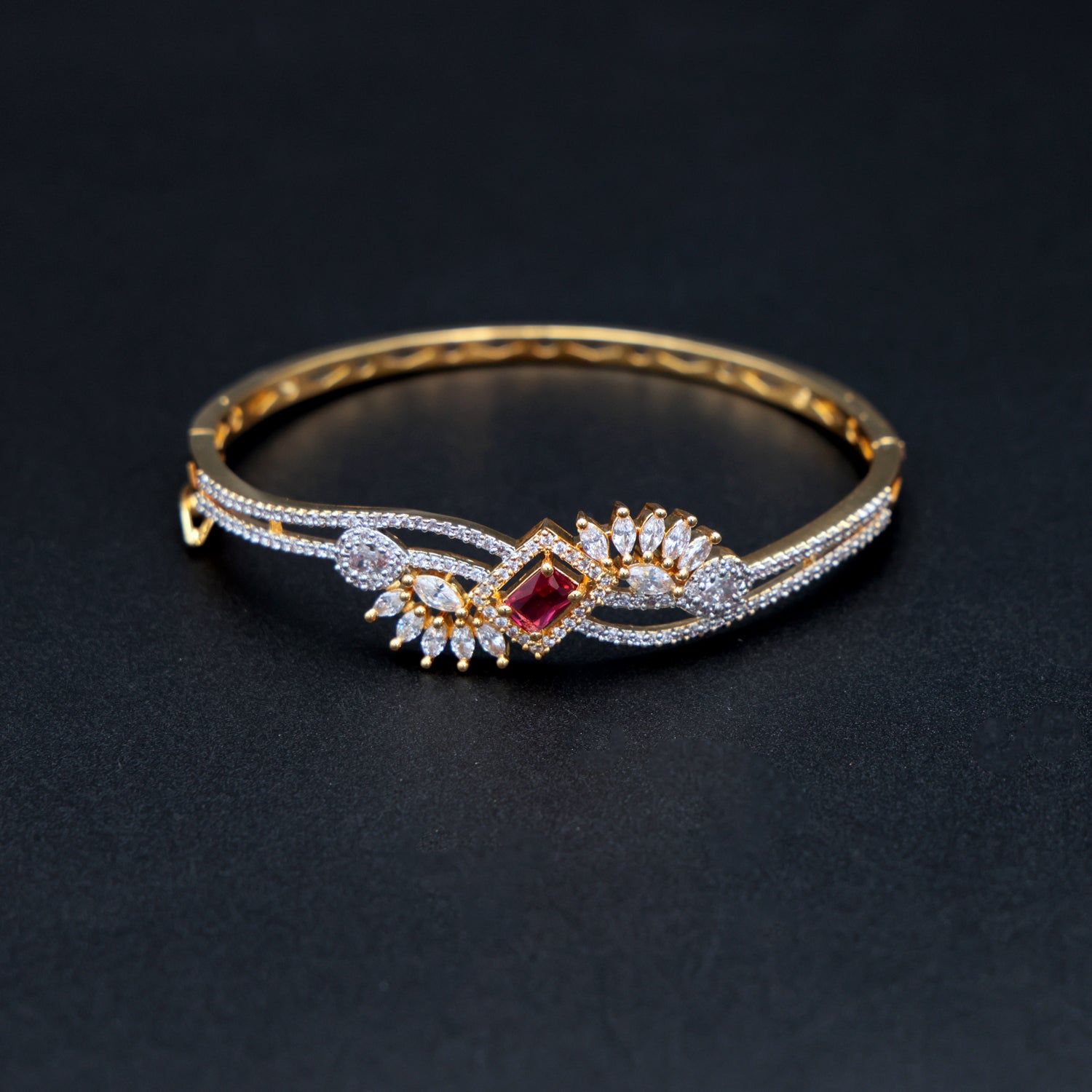 A stunning dual-tone bracelet featuring a rich ruby-colored center stone surrounded by high-quality CZ detailing. The flowing, elegant design adds instant charm, making it perfect for both ethnic and western looks. Lightweight, shiny, and ideal for elevating any outfit.