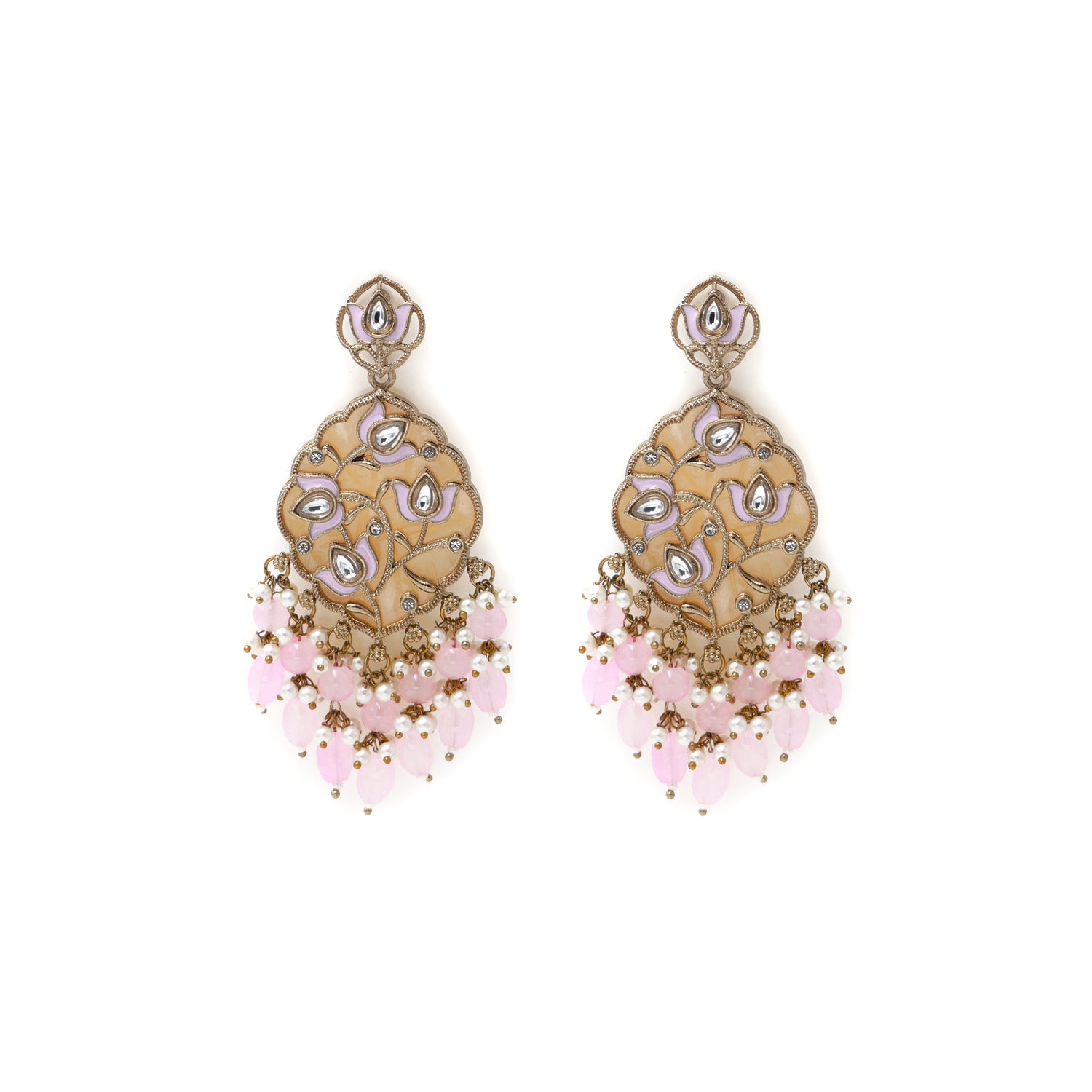 Polki Chandbali Earrings with Pearl Drops - Pink