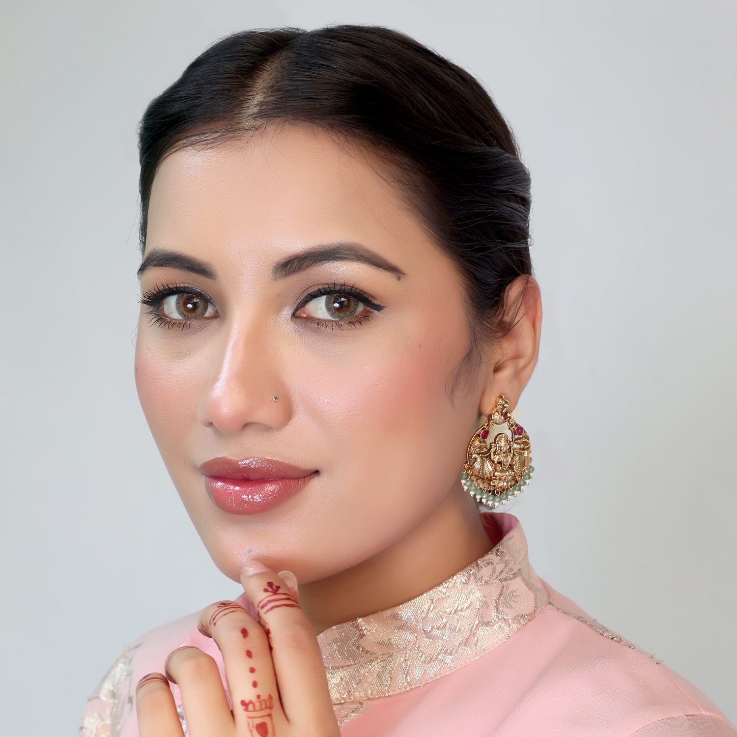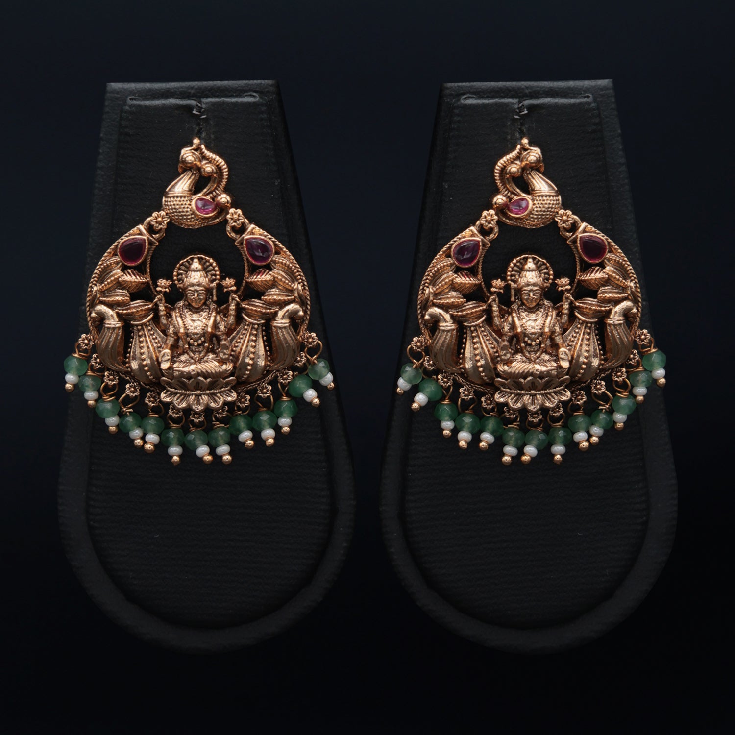 A magnificent pair of Temple Earrings featuring an intricate Goddess motif surrounded by peacocks and adorned with red and green stones. The dangling green bead detailing adds a serene pop of color, giving these earrings a rich, heritage-inspired charm. Handcrafted to reflect the grandeur of South Indian temple art, these earrings are a perfect statement of divinity and elegance.