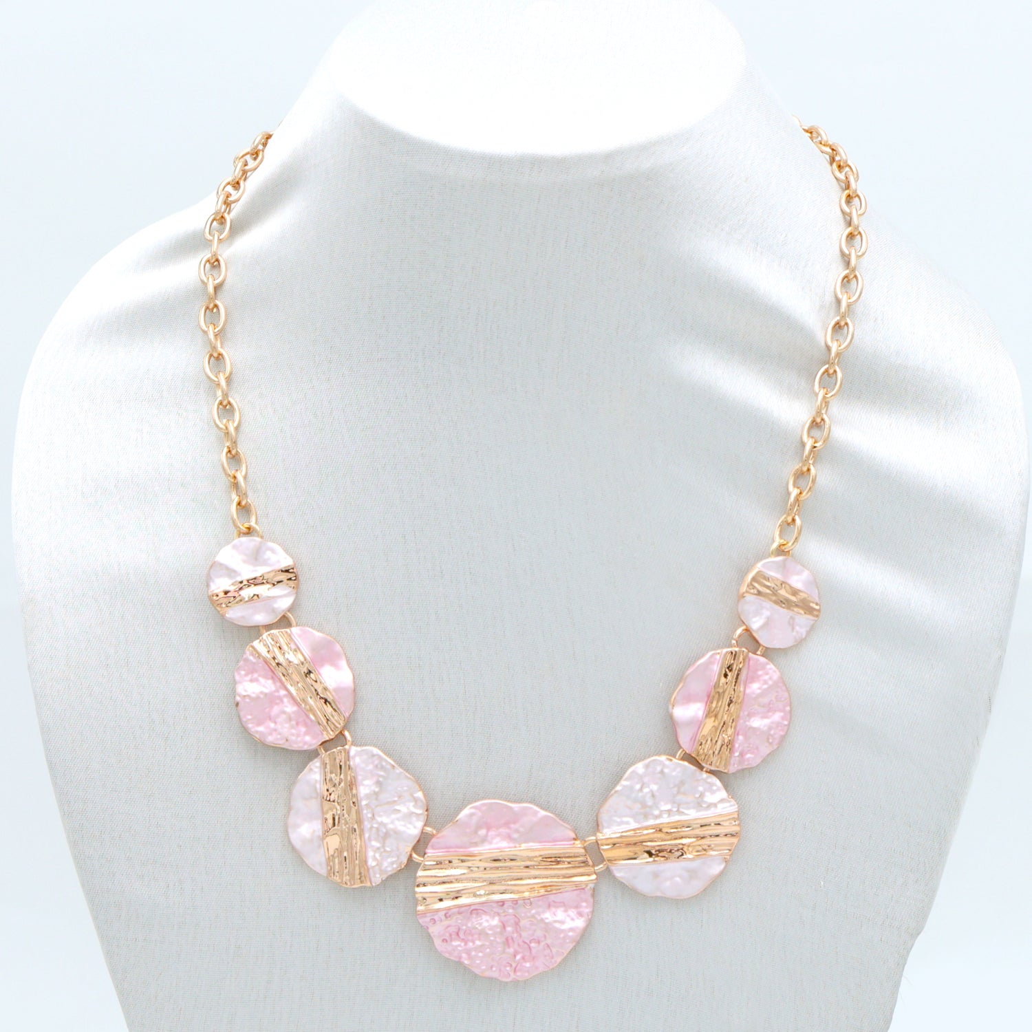 A chic and contemporary necklace featuring irregular pink and gold-toned discs with a glossy, textured finish. This design brings a modern art-inspired touch — bold yet feminine, perfect to elevate both day and evening looks.