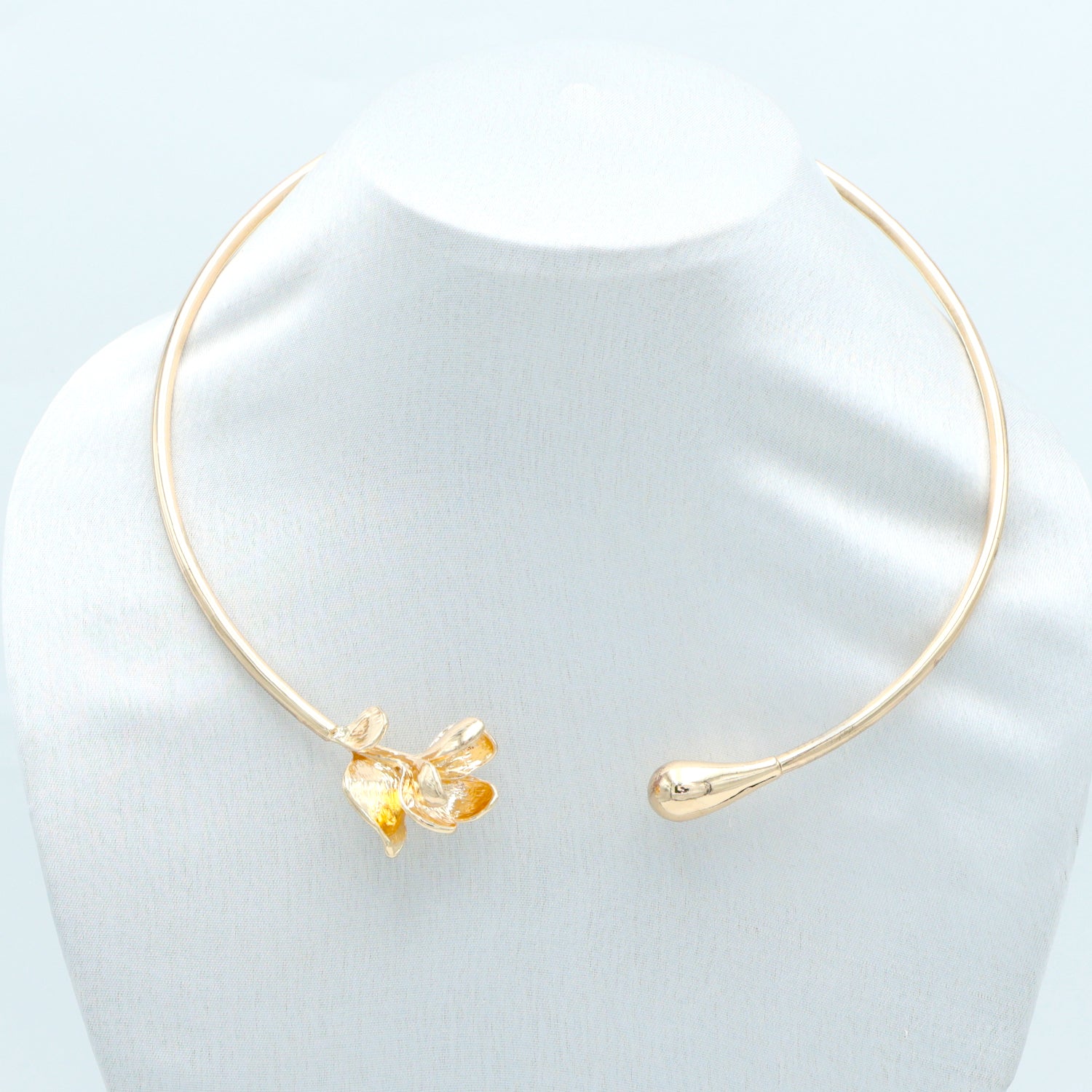 A statement of modern artistry — this open-ended choker features a sculpted golden floral motif that adds a touch of grace and individuality. Its sleek metallic form hugs the neckline beautifully, blending bold design with feminine charm.