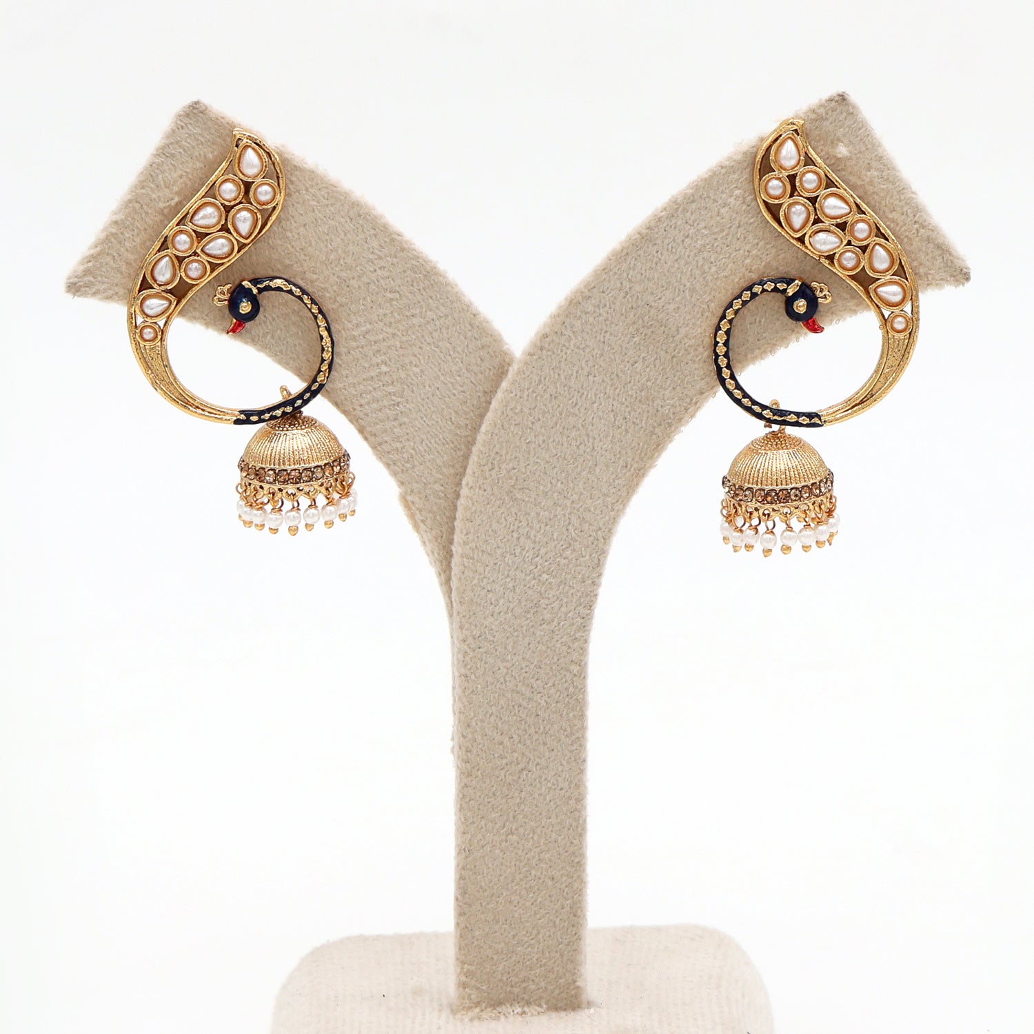 This elegant Curve Jhumka blends classic pearls with sleek black enamel, forming a graceful āSā-shaped design. The golden dome drop with pearl detailing gives it a royal touch ā ideal for those who love modern minimalism with Indian flair.
