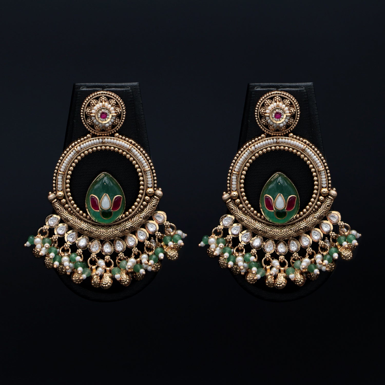 Inspired by royal Mughal artistry, this Kundan Chandbali features a green lotus motif at the center, bordered by intricate gold detailing and a cascade of pearls and emerald beads. A celebration of heritage and craftsmanship, it radiates elegance and devotion to detail — making it ideal for traditional and bridal occasions. Handcrafted to perfection for the woman who loves statement classics 🌸