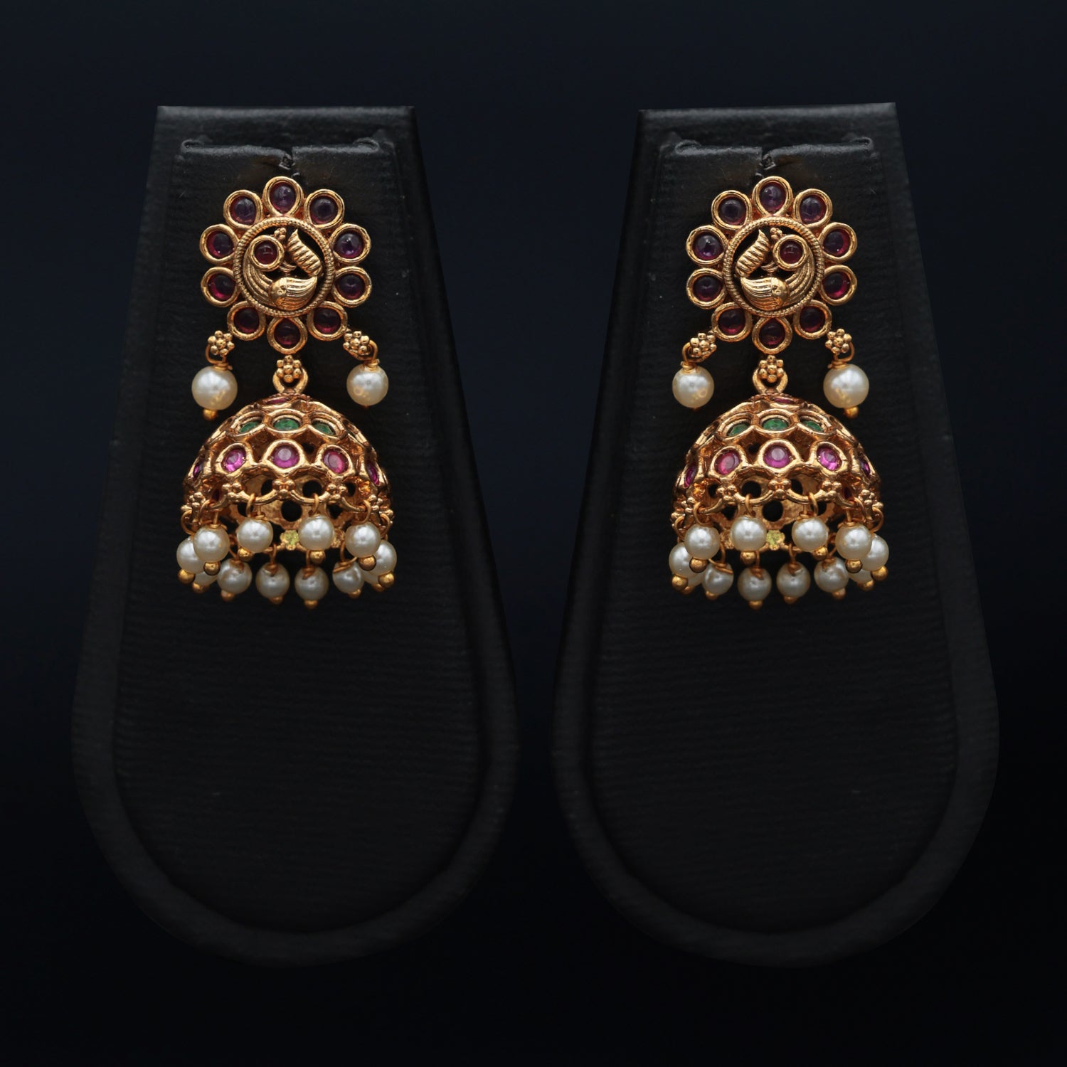 Classic yet captivating — this Ruby-Green Polki Jhumka is adorned with intricate detailing, highlighted by lustrous pearls and rich red-green stones. A perfect symbol of Indian tradition, this design beautifully complements both festive and wedding ensembles.
