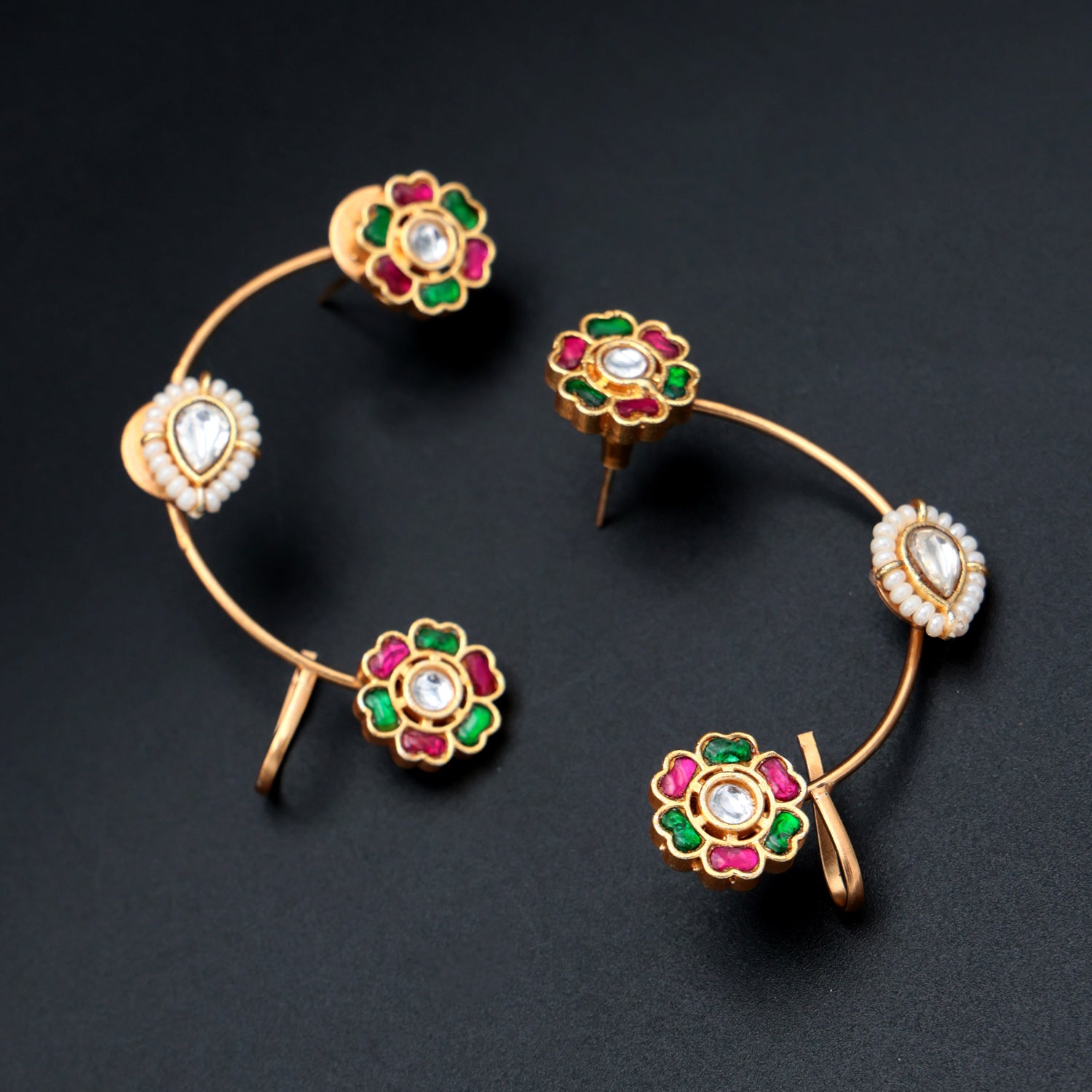 A delicate Meenakari Floral Ear Cuff that wraps your ear in understated elegance. Featuring hand-painted enamel work and tiny Polki accents, this piece brings together heritage craftsmanship with a lightweight, modern charm. Perfect for those who love a hint of color and tradition without going over the top.