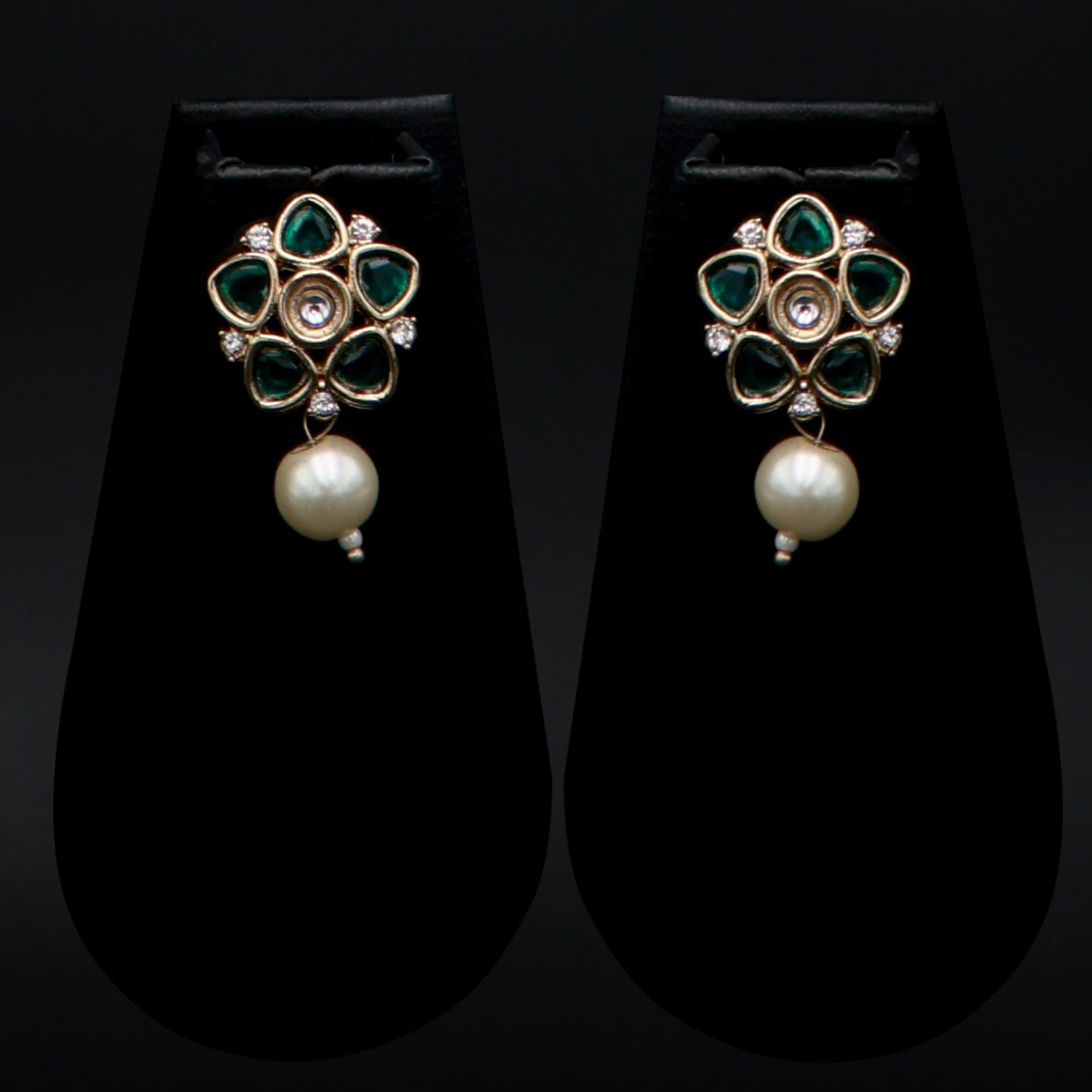 Polki Floral Stud Earrings with Pearl Drop - Dark Green