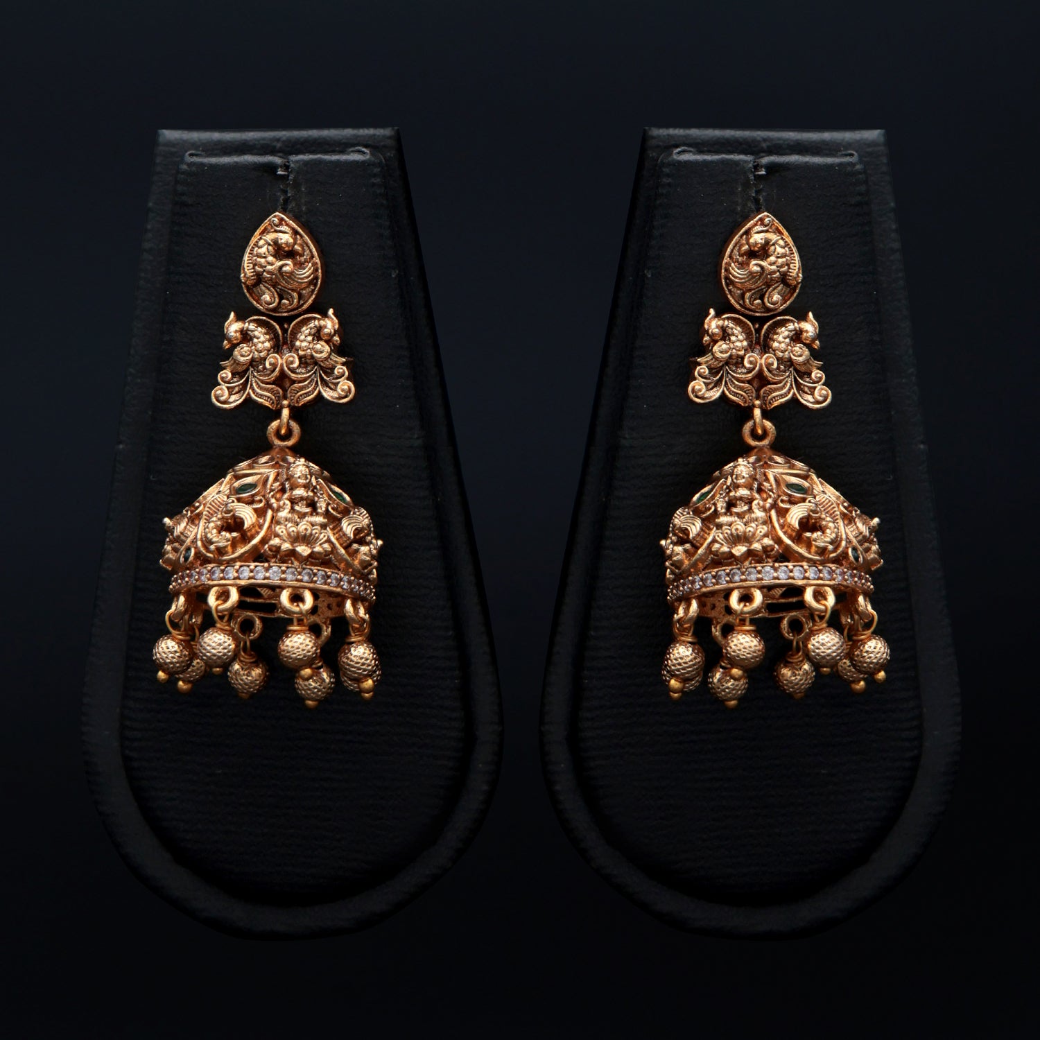 A stunning gold-plated temple-style jhumka, intricately carved with traditional motifs and adorned with petite gold beads. The ornate dome design captures the grandeur of South Indian artistry, making it a timeless pick for festive and bridal occasions. Lightweight yet regal — a true blend of tradition, devotion, and design excellence.