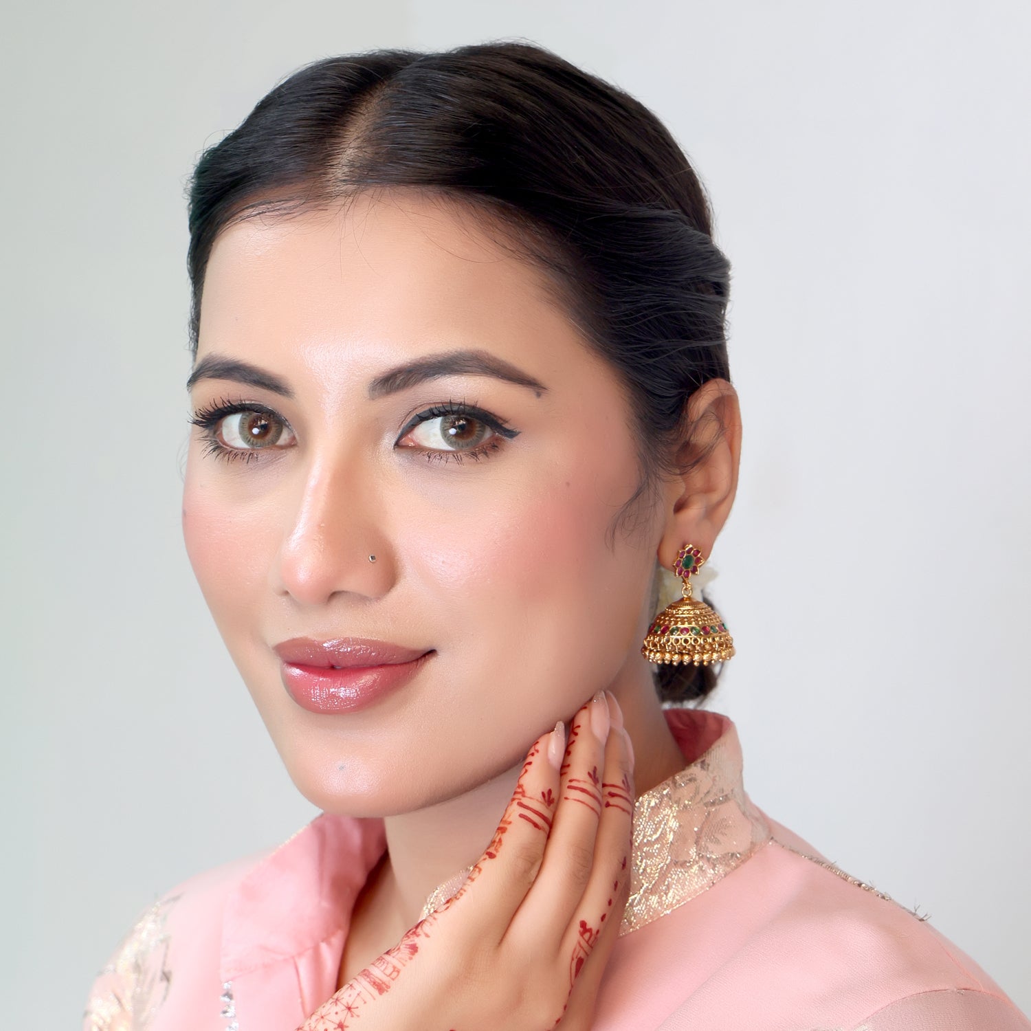 A beautiful blend of tradition and sophistication, this Pearl Drop Jhumka features a radiant pearl centre surrounded by Polki work and finished with red and green accents. The delicate golden dome and pearl fringe make it an ideal choice for both festive and semi-traditional occasions.