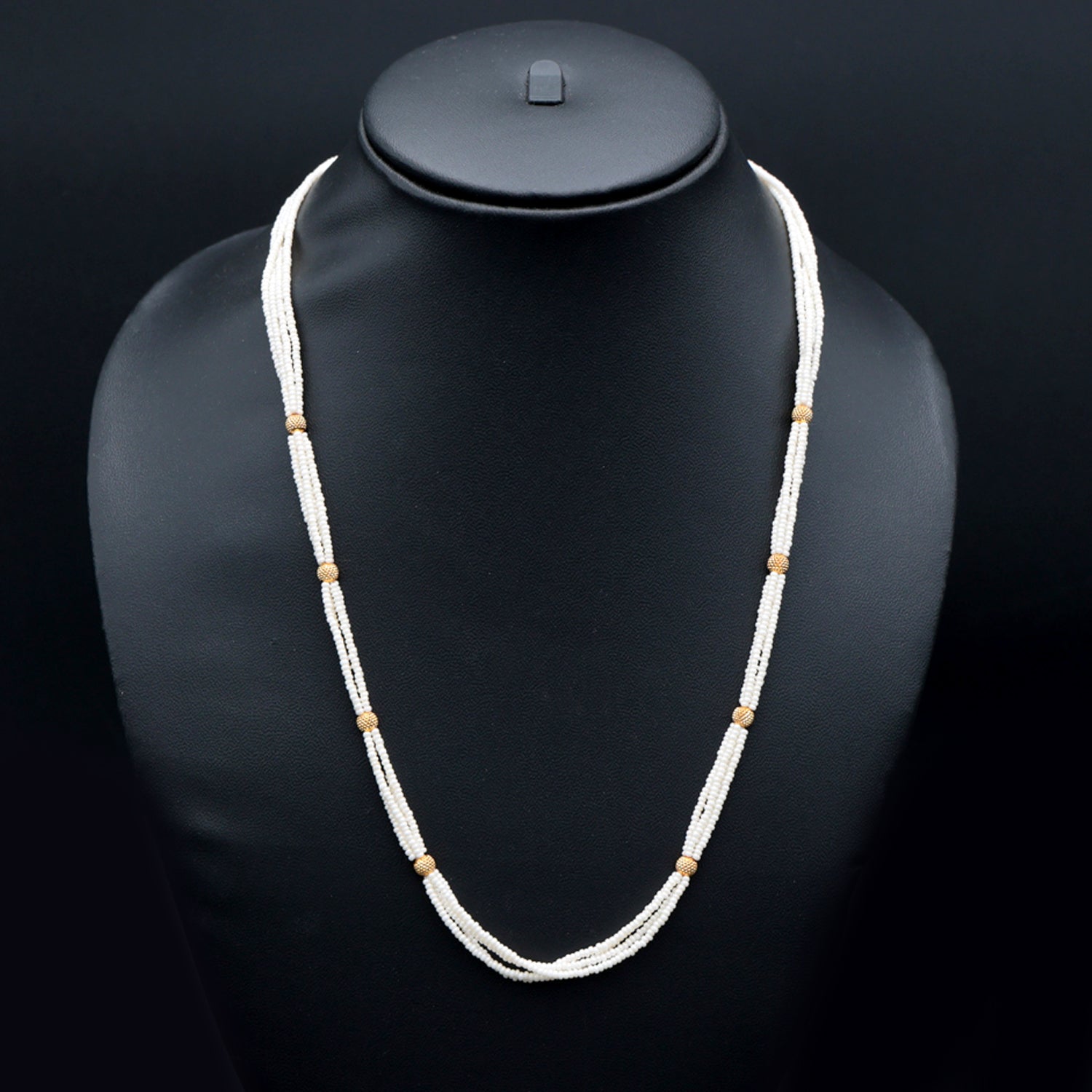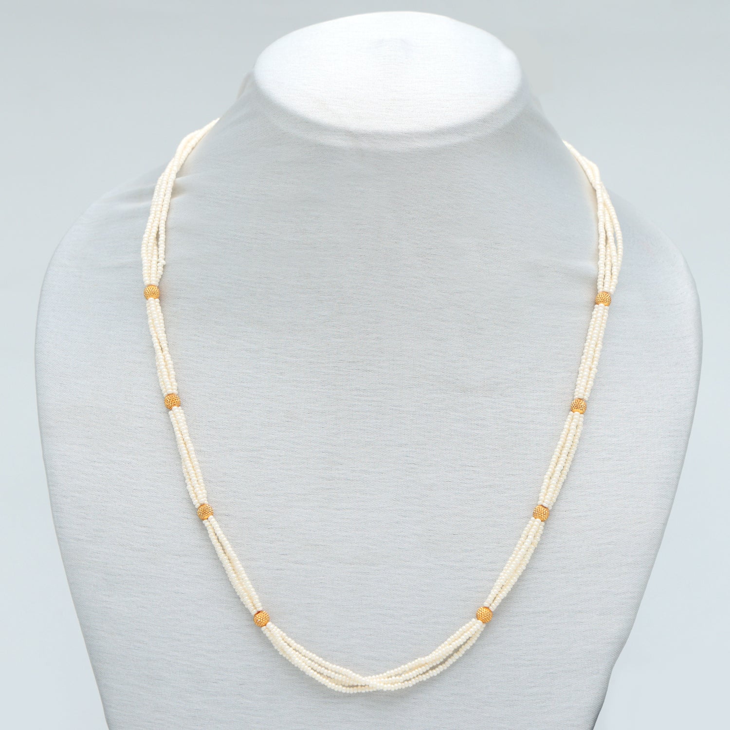 A graceful Indian-style necklace crafted with delicate mini pearl beads arranged in soft multi-strands. Accented with tiny gold-toned spacers, this piece brings a classic and refined charm to any traditional outfit. Lightweight, elegant, and perfect for adding a subtle yet rich touch to your look.