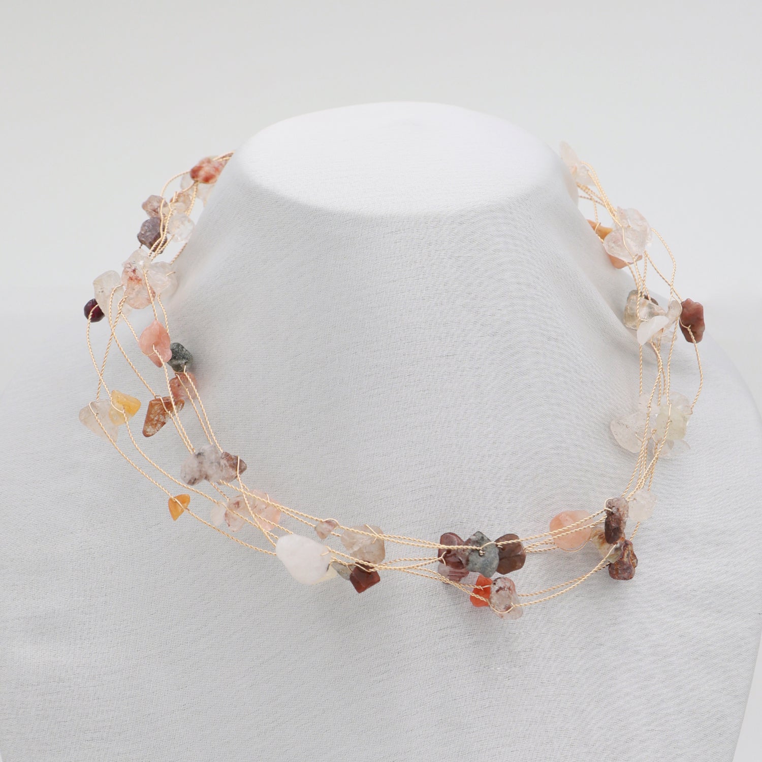 Nspired by the beauty of nature, the Terra Multi-Strand Necklace features uncut raw crystals delicately suspended on fine golden threads. Each stone reflects a unique hue, capturing the warmth of earthy tones and the lightness of modern artistry. It’s effortlessly elegant — perfect for adding texture and a hint of mystique to any look.