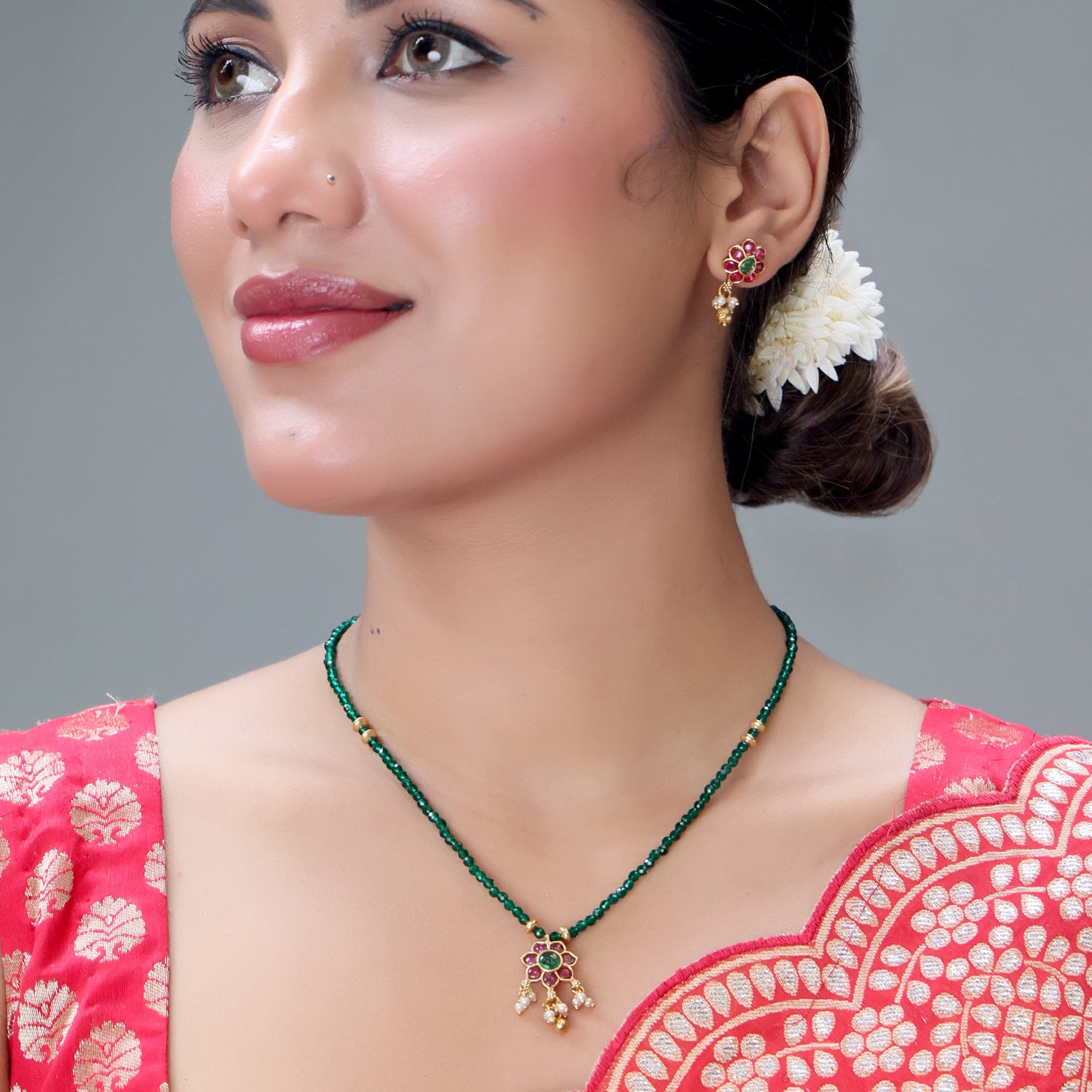A simple and elegant green beaded necklace set featuring a delicate pendant adorned with red stones, pearls, and golden details. Paired with matching earrings, this set brings a soft traditional charm perfect for everyday wear or small functions. Lightweight, graceful, and timeless.