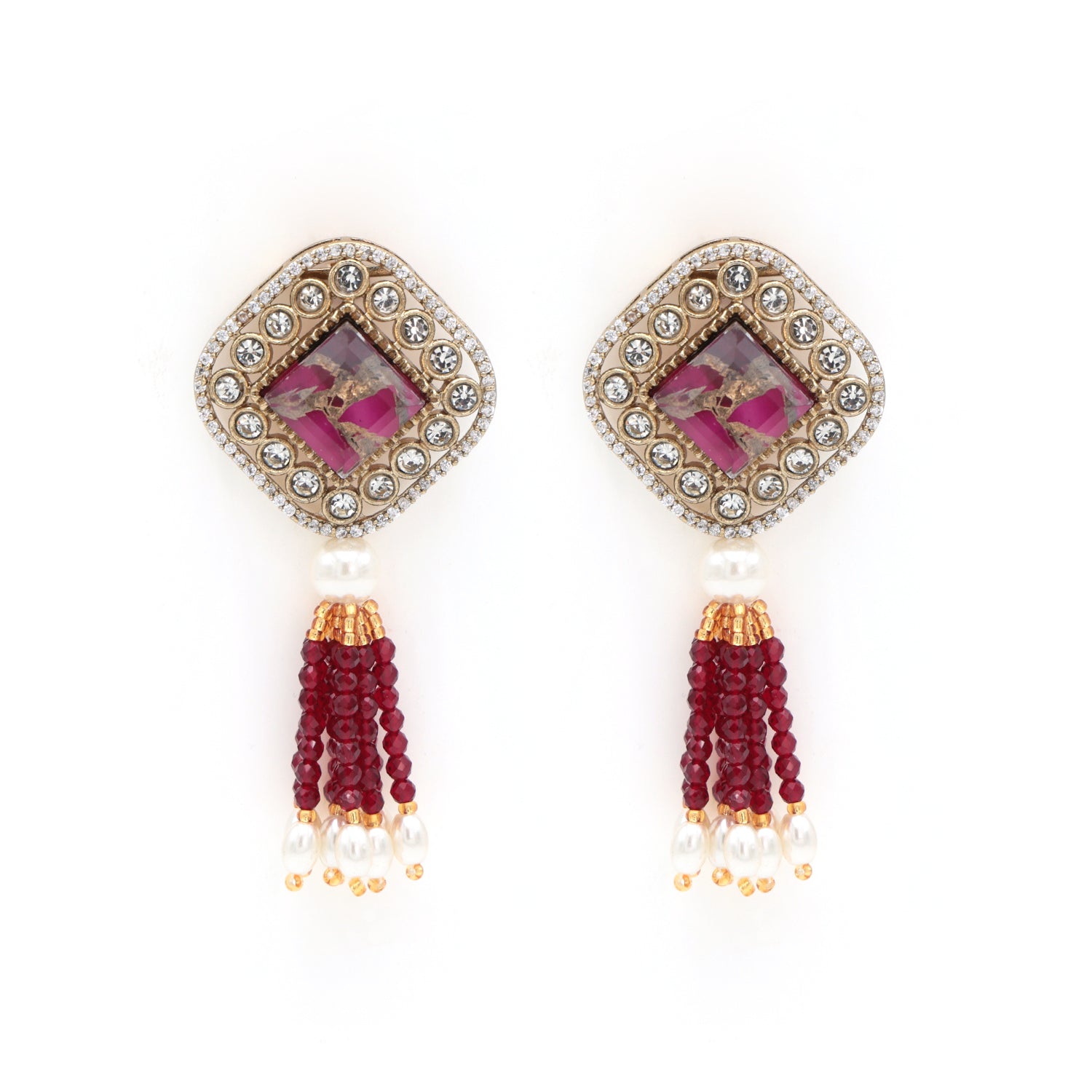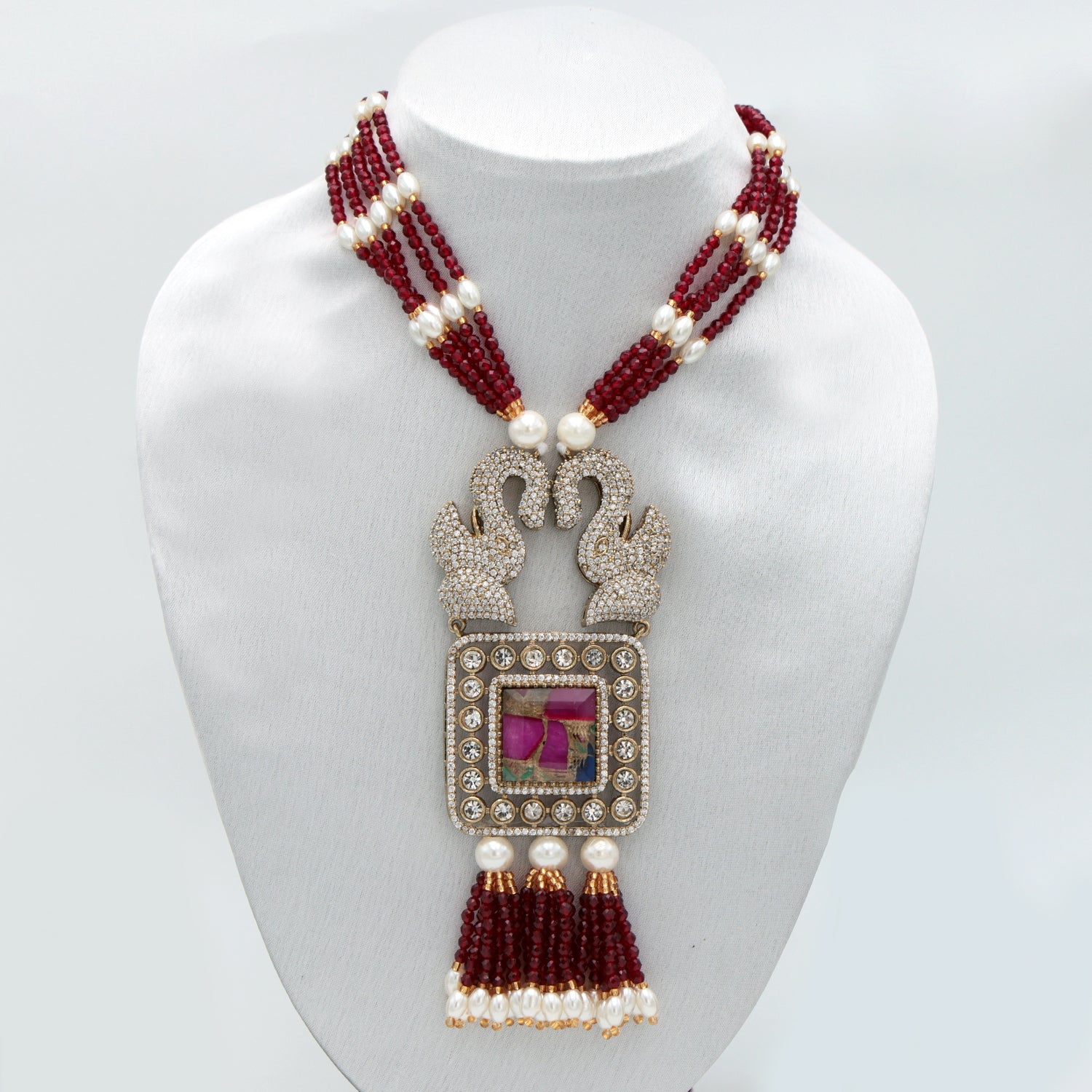 The Red Meenakari Pearl Necklace Set is a masterpiece of traditional craftsmanship and graceful elegance. Featuring intricate Meenakari work in vibrant red with delicate floral motifs, it is paired with multi-layered pearl strands for a regal finish. Accented with a matching statement earring and a drop pearl for added sophistication — perfect for festive and cultural occasions.