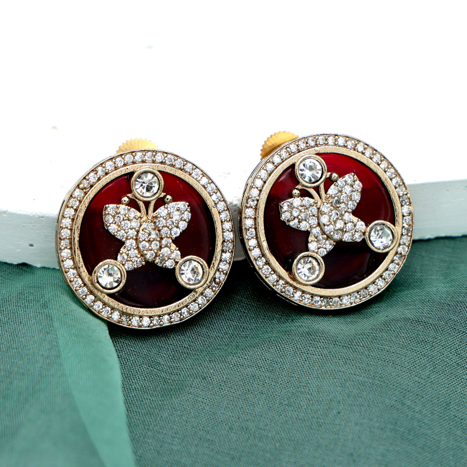 Classic meets contemporary with these stunning red enamel stud earrings, featuring a floral motif adorned with sparkling stones and pearls. The perfect mix of Indian richness and western charm — elegant, timeless, and versatile.