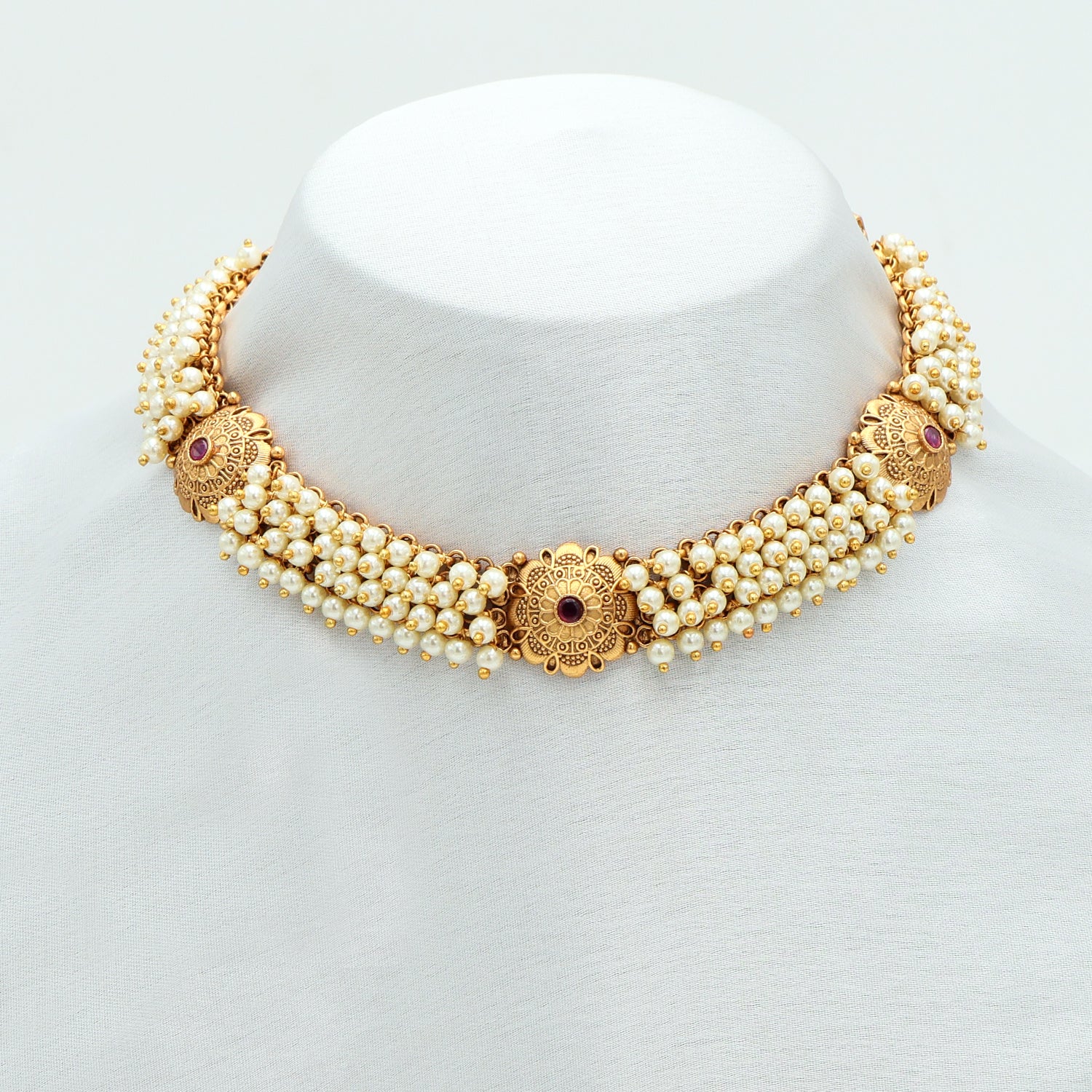 Antique Gold Pearl Choker Necklace & Jhumka Earrings Set