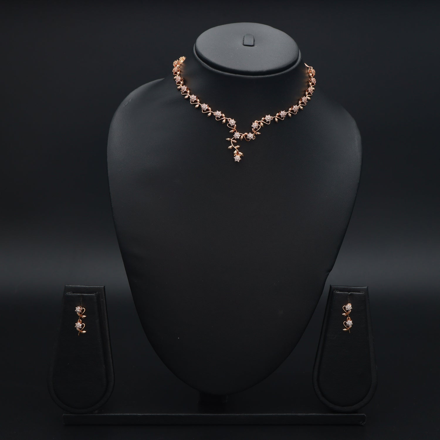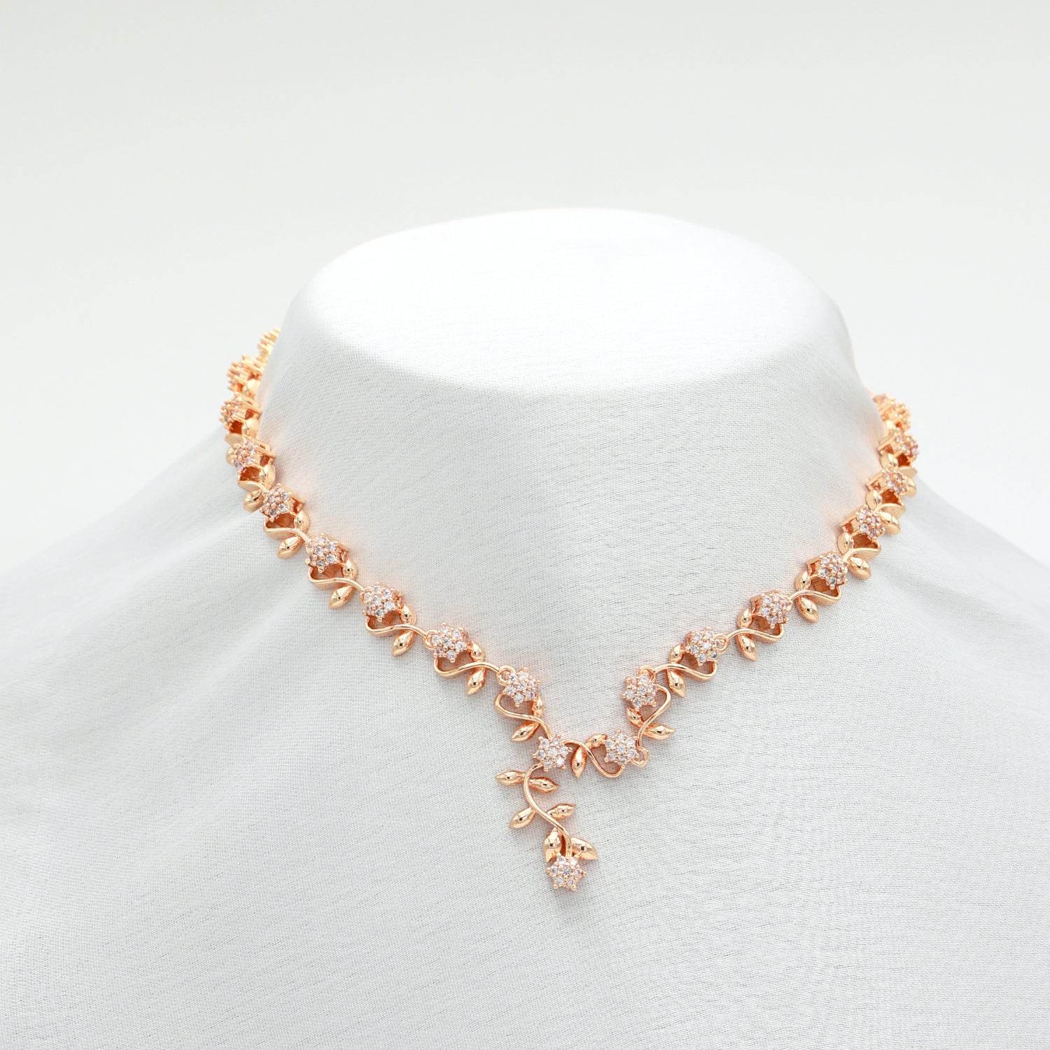Inspired by nature’s elegance, this floral CZ necklace set in rose gold exudes effortless charm. Its dainty design transitions seamlessly from ethnic celebrations to chic Western soirées, making it a true wardrobe staple.