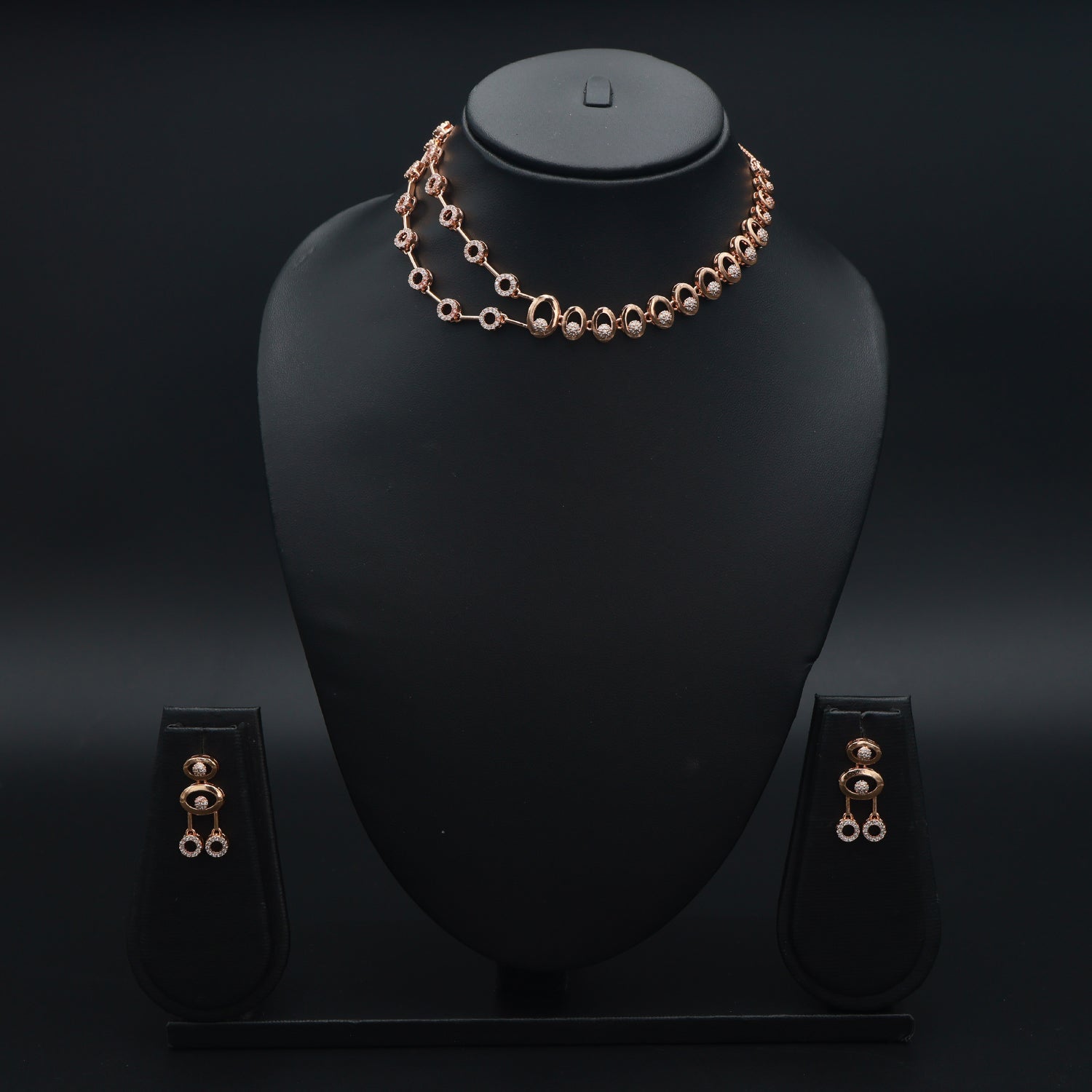 A sleek blend of Indian grace and Western chic, this rose gold CZ set adds instant sparkle to any outfit. Its modern circular motifs make it perfect for both sarees and evening gowns — elegant, versatile, and effortlessly stylish.