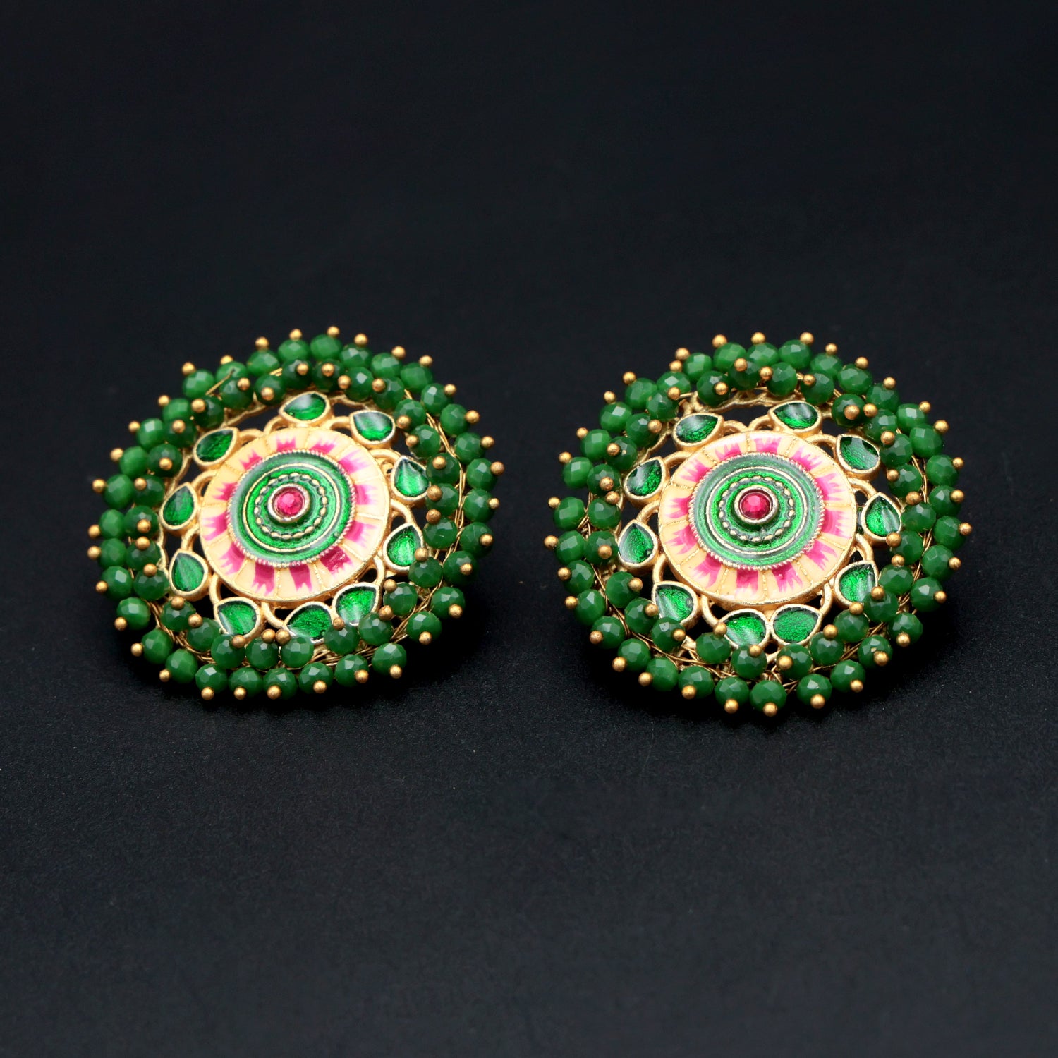 Embrace timeless tradition with these Green Meenakari Lotus Stud Earrings, beautifully detailed with intricate hand enamel work and fine bead accents. The vibrant lotus motif symbolizes grace and purity, while the green hue adds a regal touch — perfect for festive and ethnic wear.