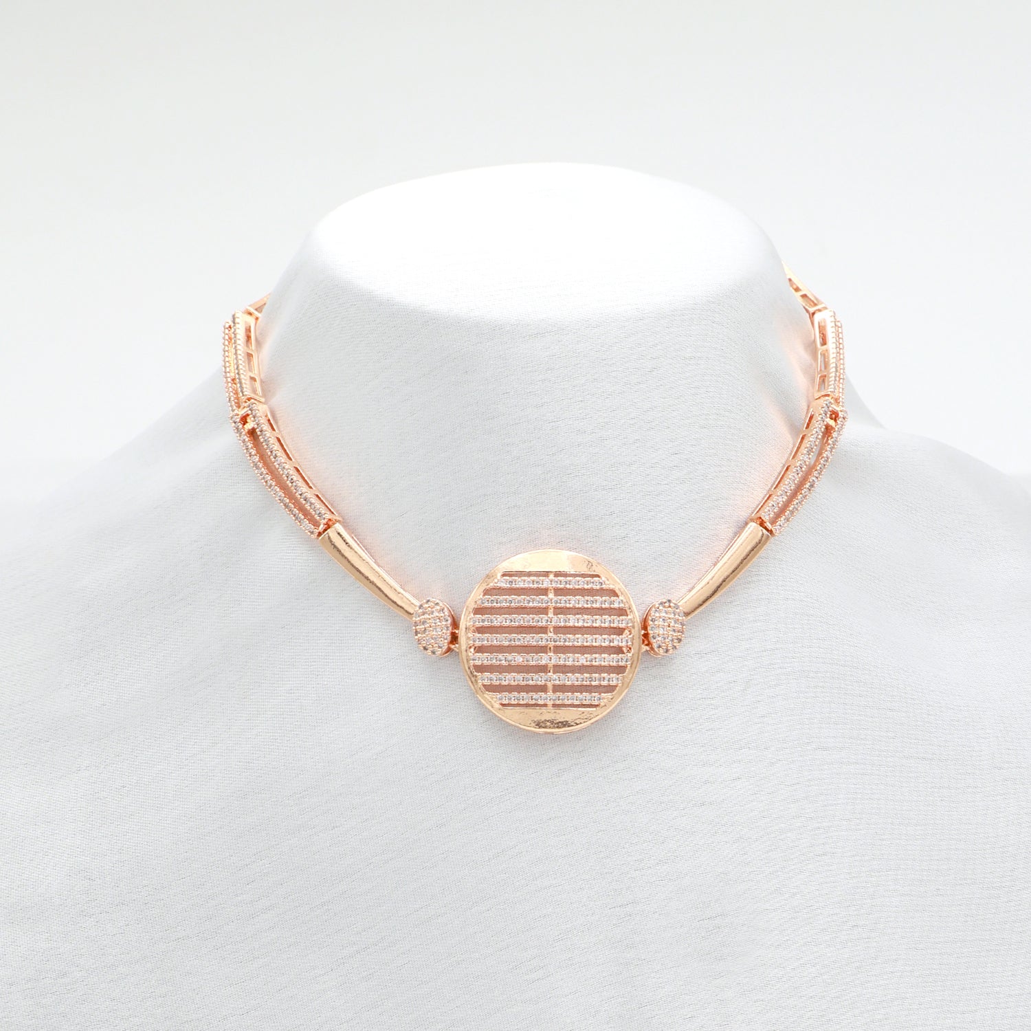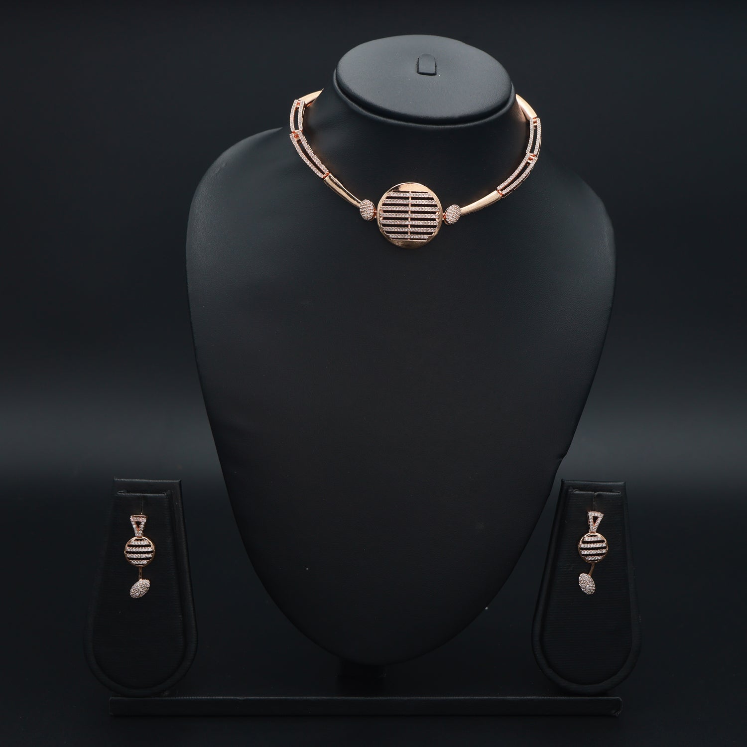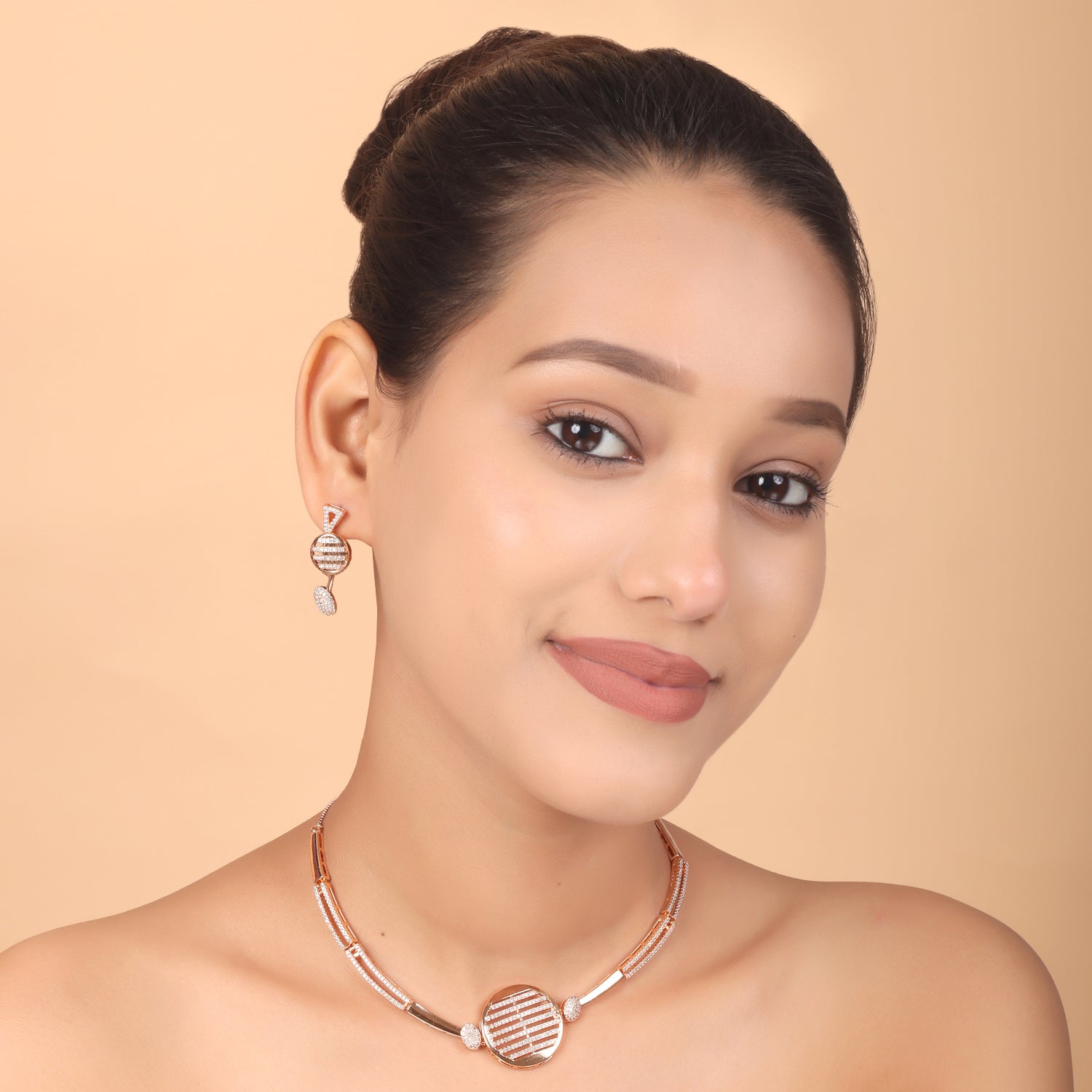 A sleek blend of Indian grace and Western chic, this rose gold CZ set adds instant sparkle to any outfit.Its modern circular motifs make it perfect for both sarees and evening gowns — elegant, versatile, and effortlessly stylish.
