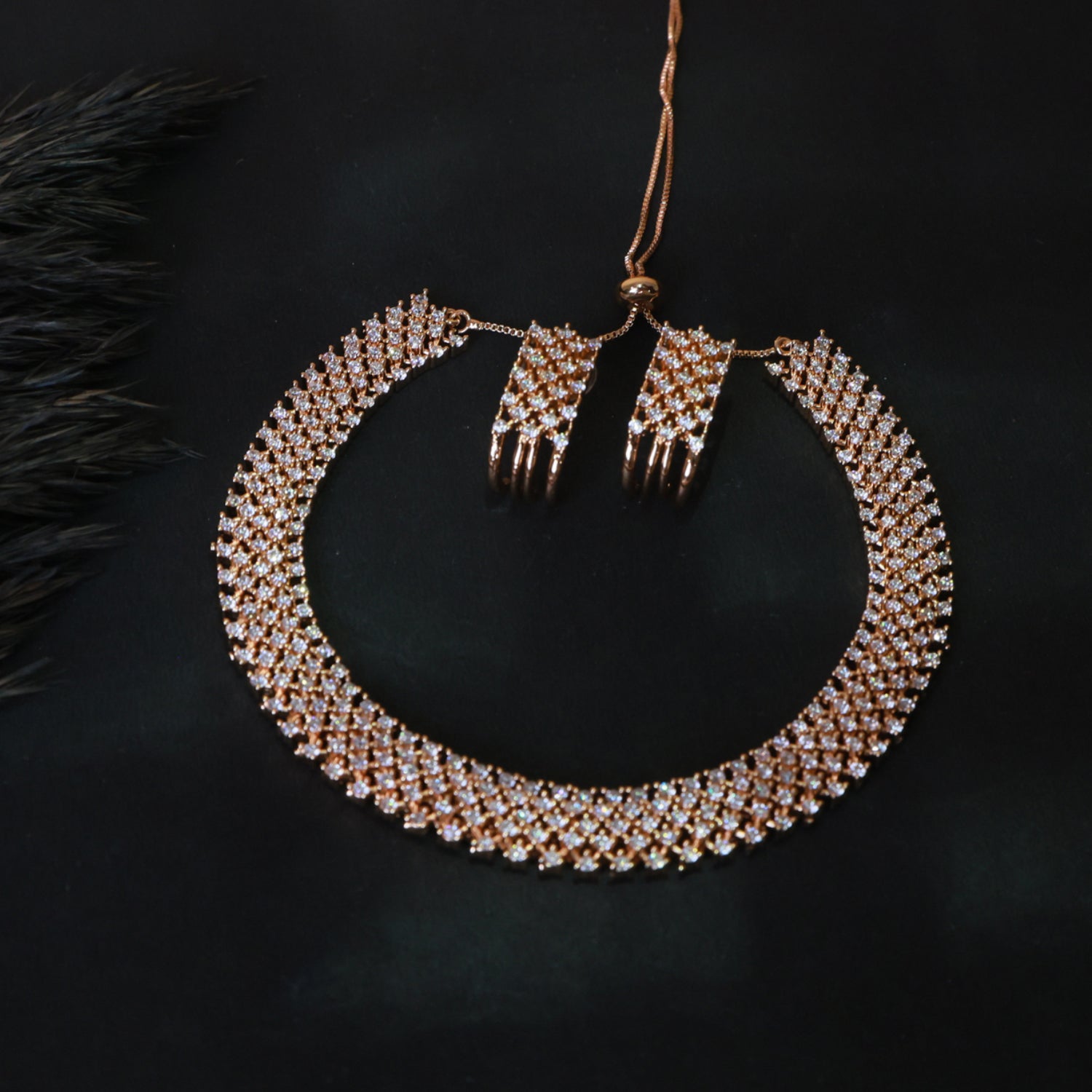 A timeless piece that blends elegance with versatility — this rose gold crystal mesh choker necklace set features fine stone detailing that radiates subtle glamour. Perfectly crafted to complement both Indian and Western attire, it adds a touch of sophistication whether paired with a saree, gown, or evening dress.
