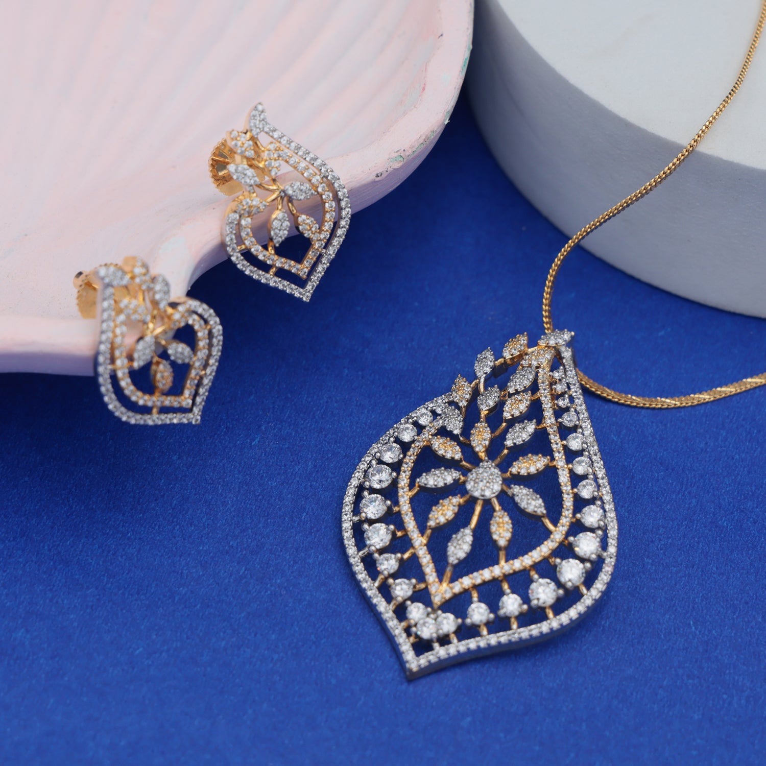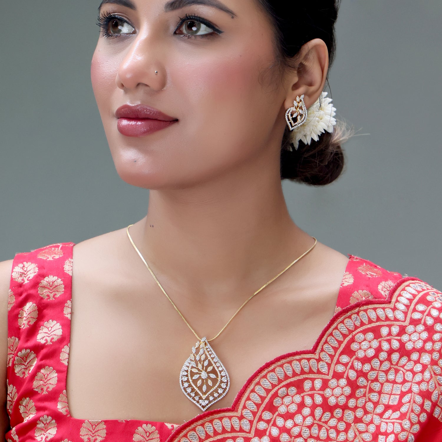 A stylish leaf-shaped CZ pendant paired with matching earrings, crafted in a sleek gold finish. The intricate cutwork and shimmering stones make it perfect for both refined traditional looks and subtle Western styling. Lightweight, versatile, and effortlessly elegant.