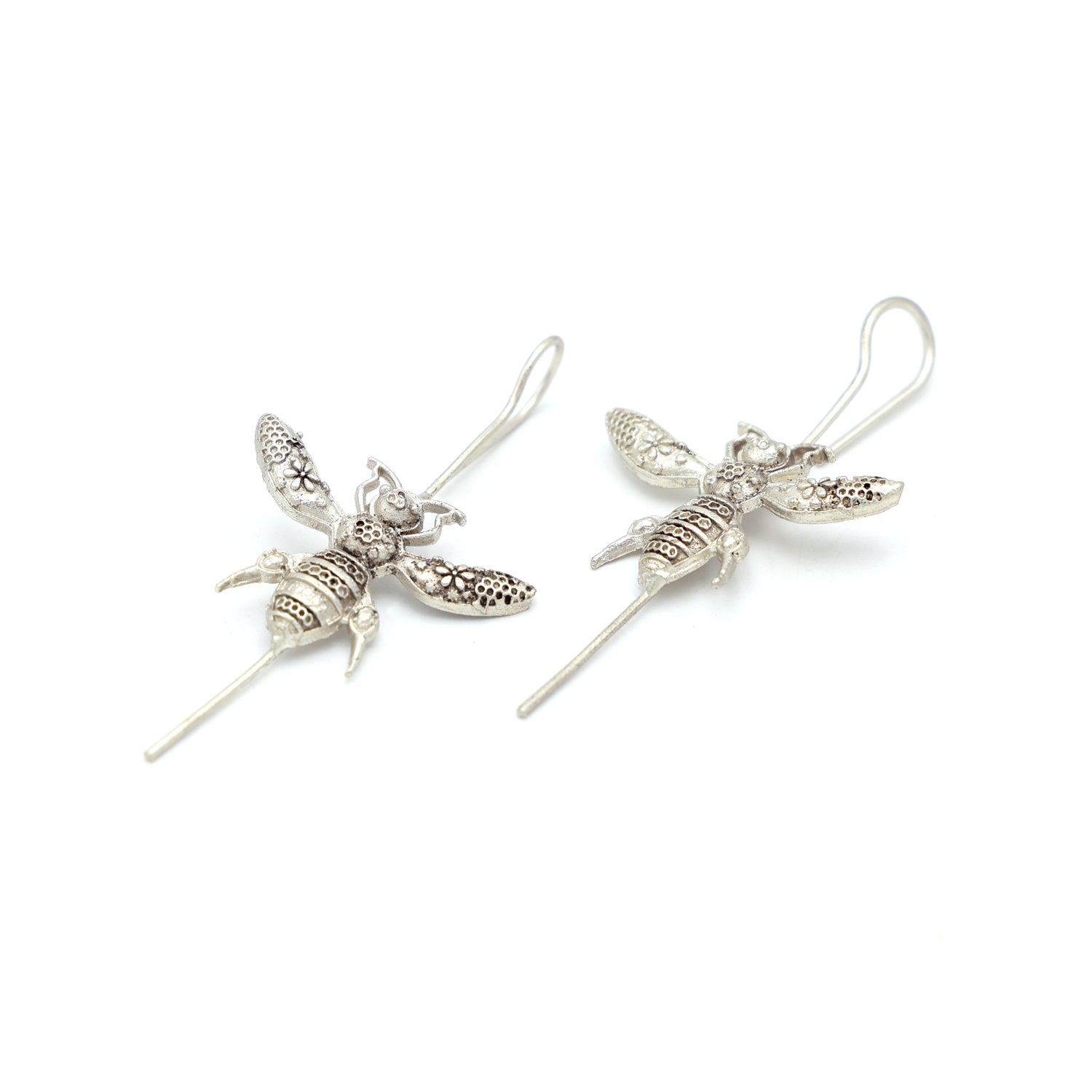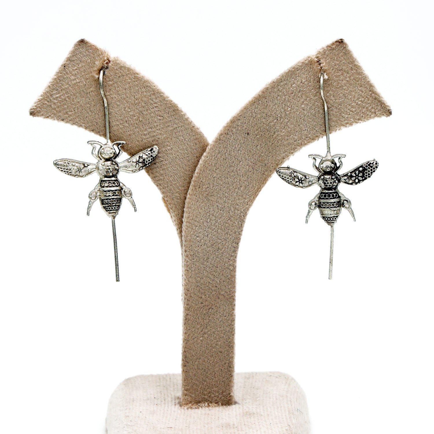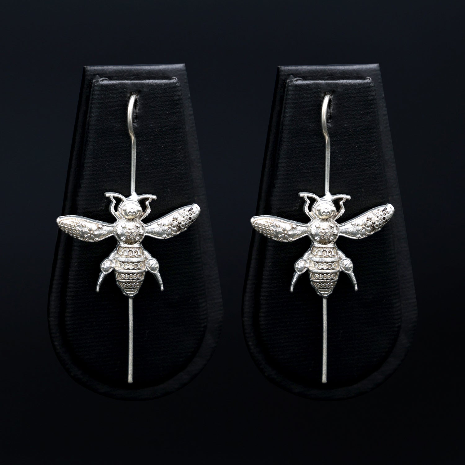 A bold and artistic pair of earrings featuring a detailed bee motif crafted in a sleek silver-tone finish. The elongated drop design adds a touch of drama, making this piece perfect for fashion-forward looks. Lightweight yet striking, it beautifully blends creativity with elegance.