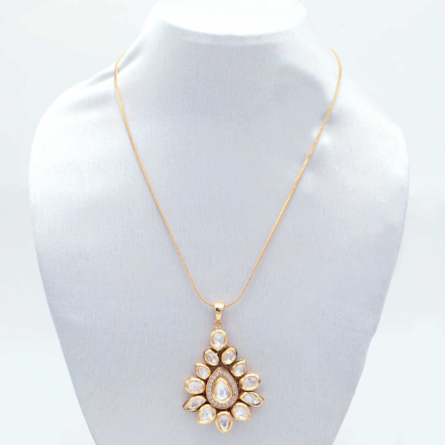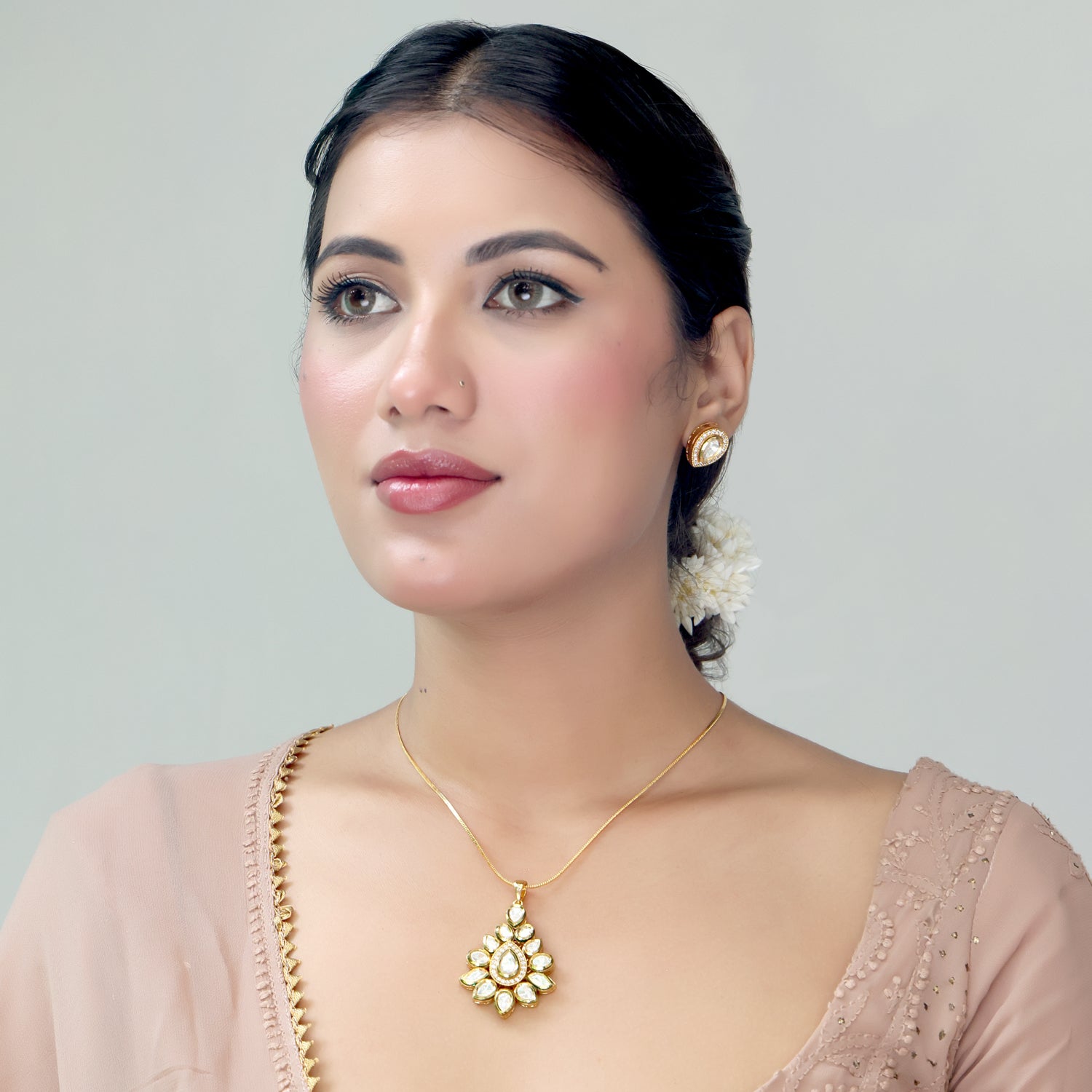 Timeless and elegant, this Polki pendant set features a teardrop design surrounded by luminous uncut-style stones in a gold-plated frame. The minimal chain and matching studs make it a versatile piece — perfect for both festive and everyday ethnic elegance.