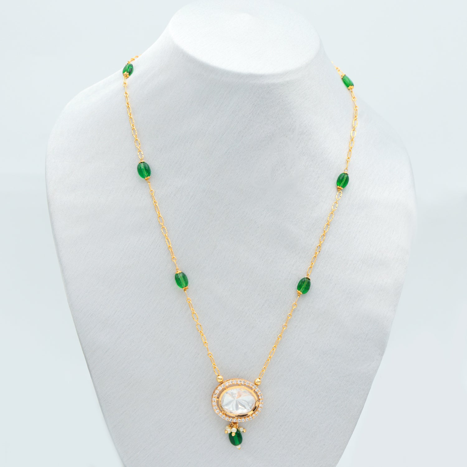 A stunning handcrafted kundan choker set featuring lotus motifs, green enamel detailing and delicate pearl drops. The matching long statement earrings beautifully complement the choker, creating a regal and graceful traditional look.