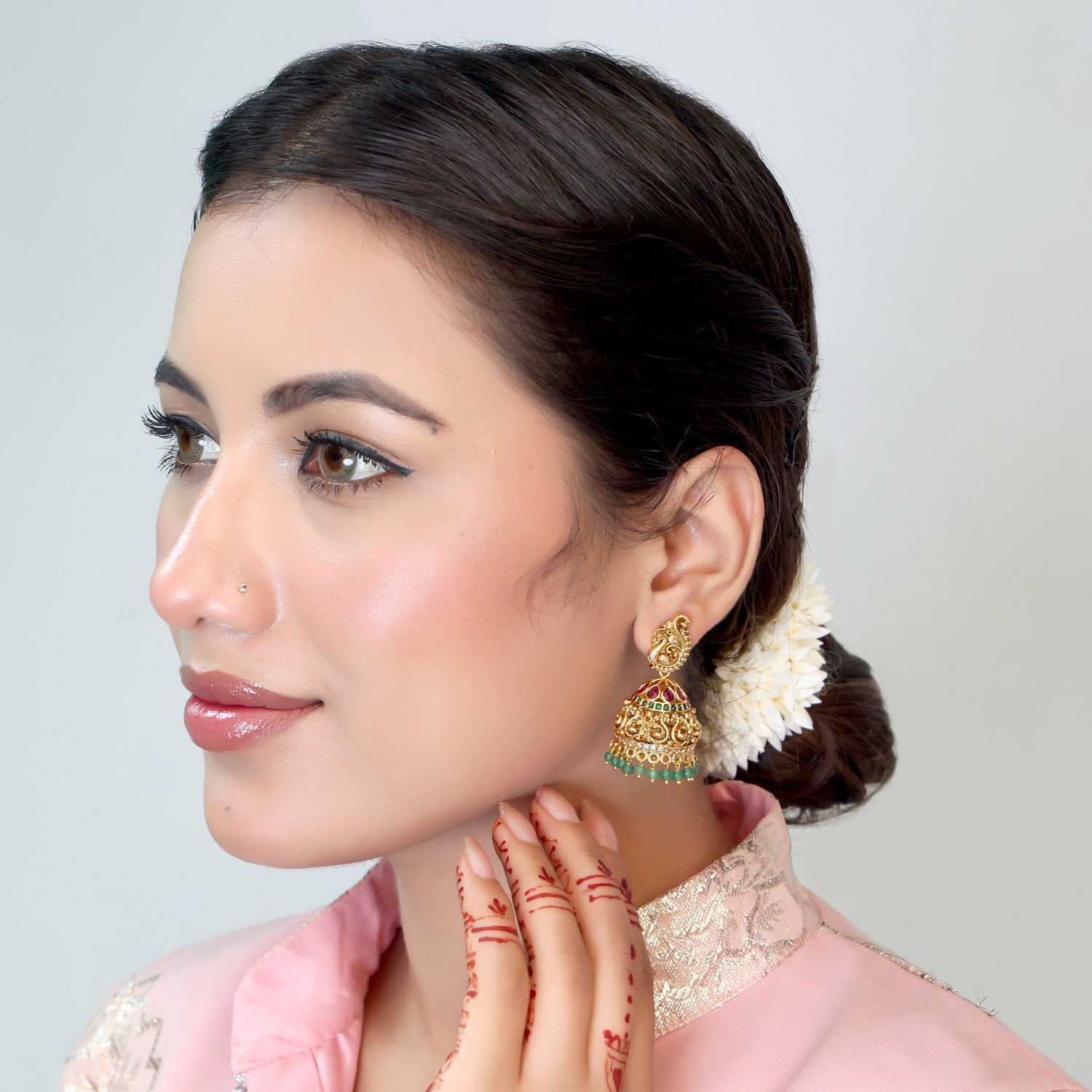 Handcrafted in an antique gold finish, this temple-inspired jhumka features intricate peacock motifs, ruby and emerald enamel work, and a row of green bead drops for a divine touch. Symbolizing grace and prosperity, this design captures the spirit of timeless South Indian craftsmanship. A perfect blend of tradition, culture, and elegance 💫