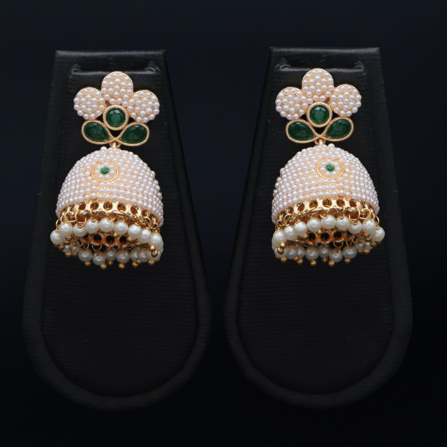A beautifully handcrafted pearl-detailed jhumka with a floral top and emerald green accents, exuding timeless Indian sophistication. The dome is encrusted with fine pearls and finished with a delicate pearl fringe — perfect for adding a soft, royal touch to your festive attire.