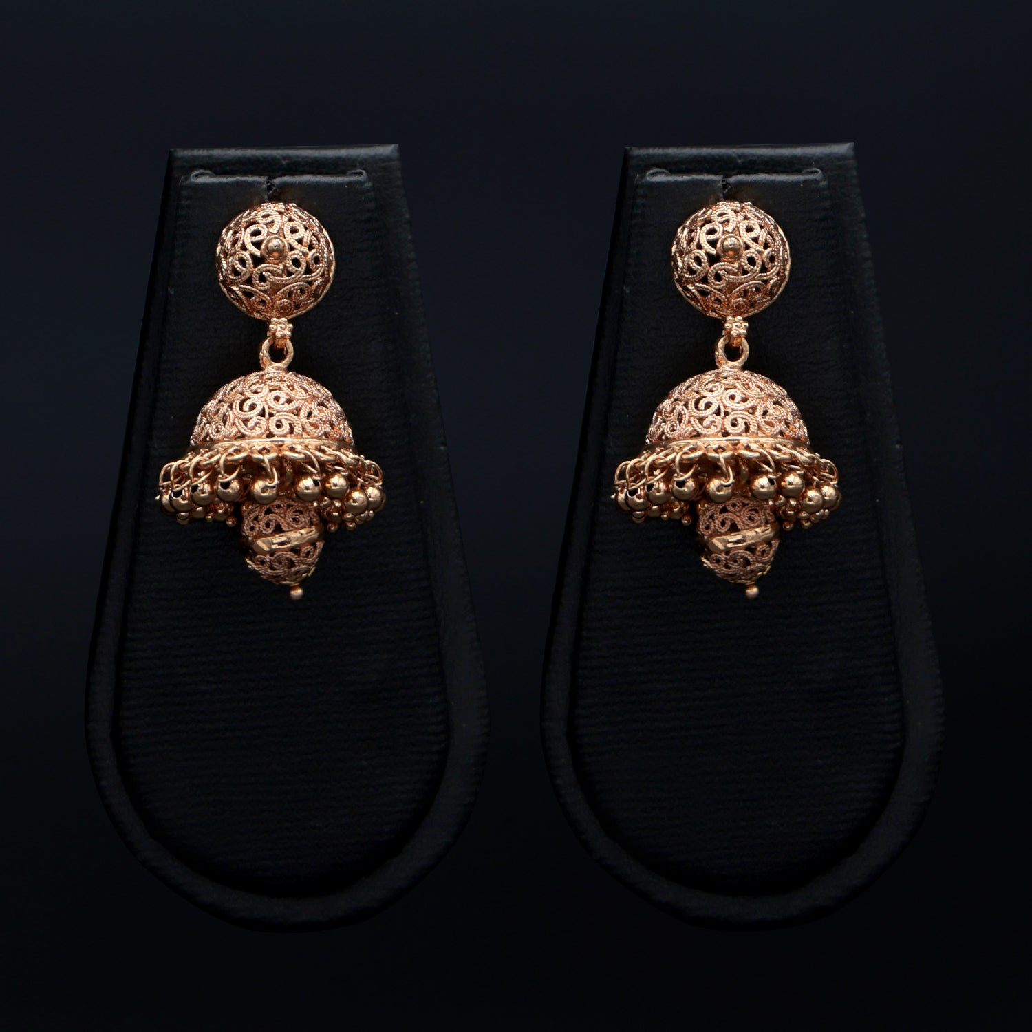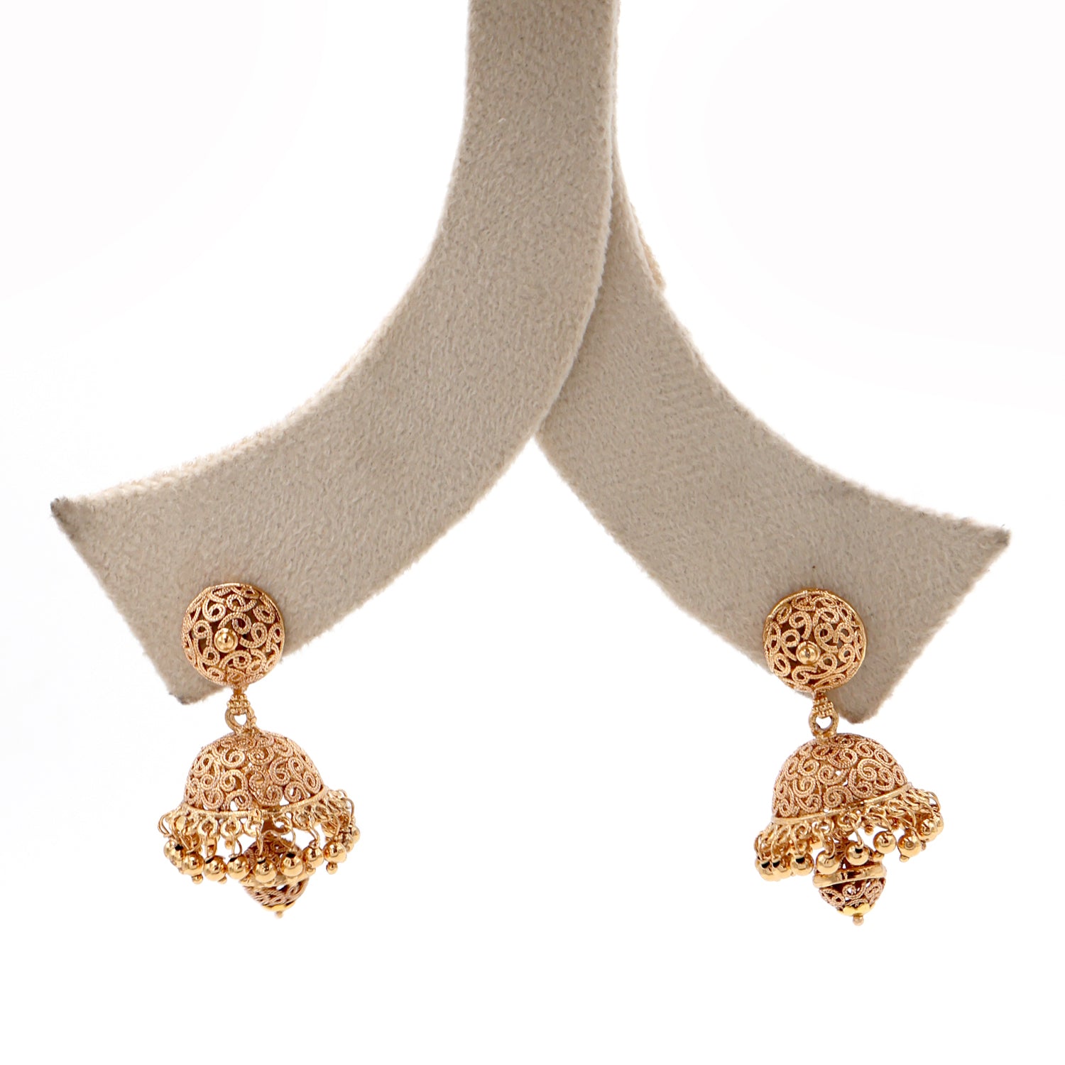 A classic Filigree Dome Jhumka crafted in a radiant gold tone, showcasing intricate lattice work and a graceful dome silhouette. Lightweight yet regal, this pair celebrates the essence of traditional Indian artistry — perfect for elevating any festive or ethnic look.