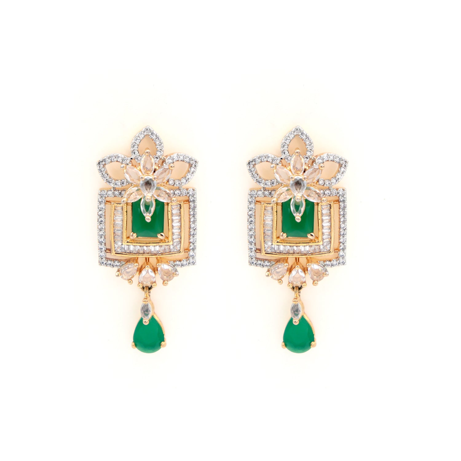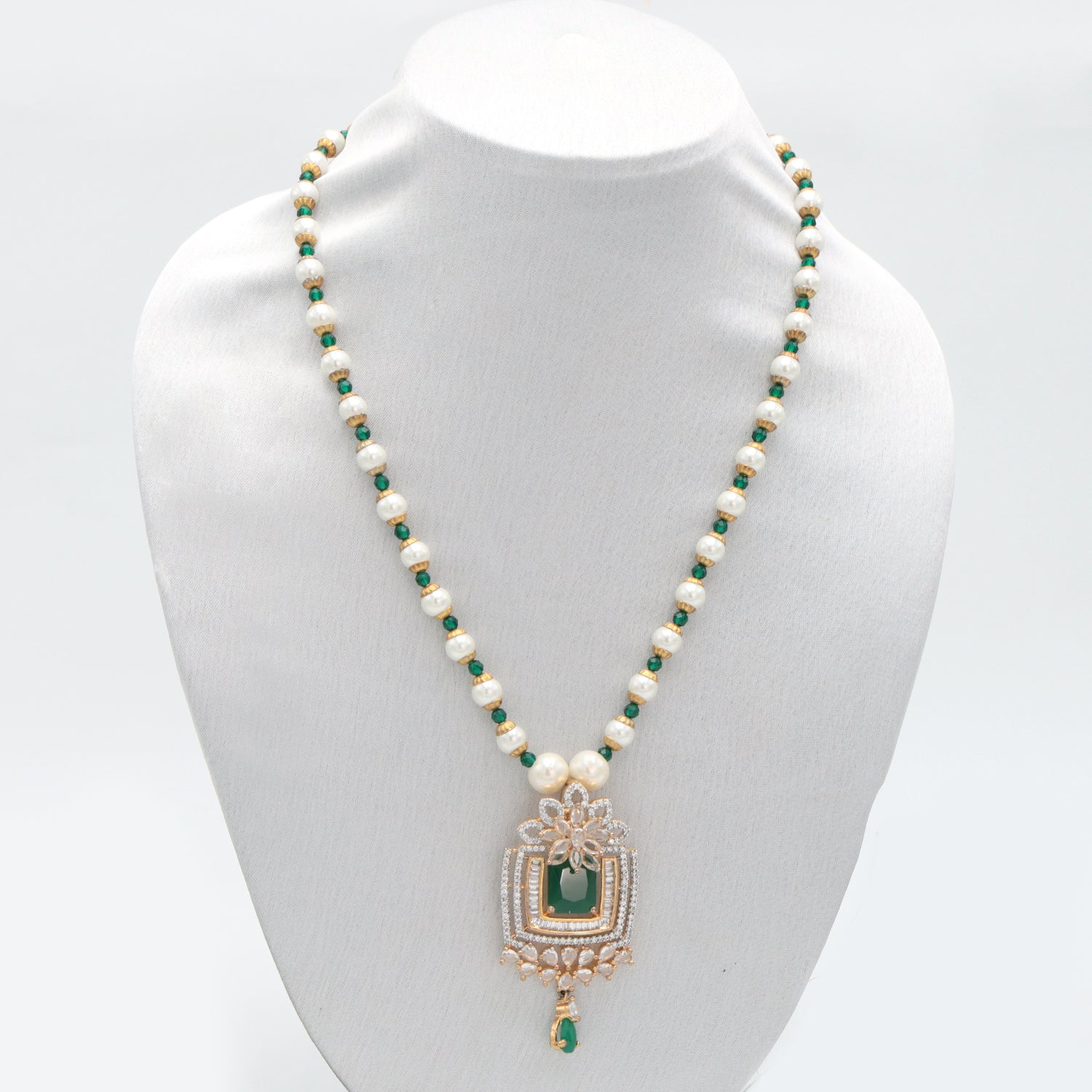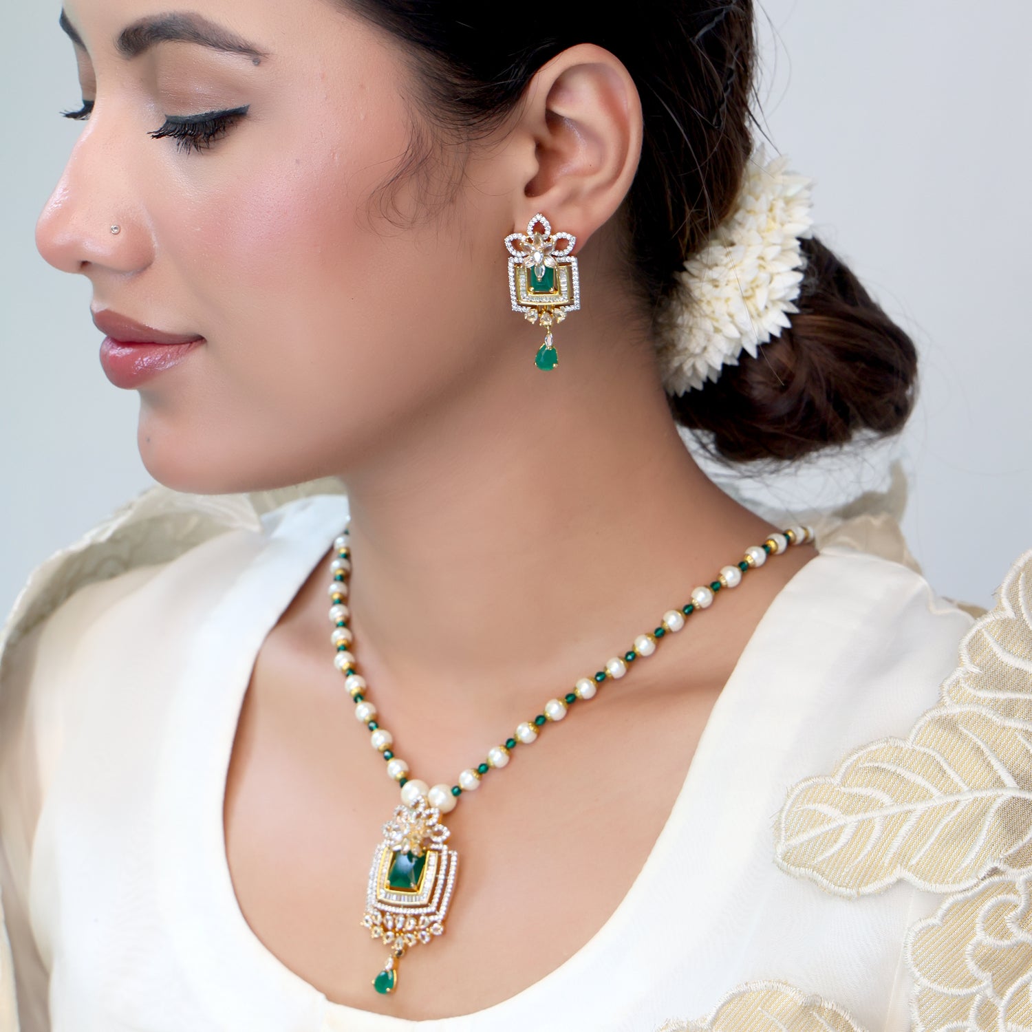 A graceful Emerald Polki Necklace Set designed with lustrous pearls and dazzling polki stones. The statement pendant features a radiant emerald centerpiece surrounded by intricate detailing, exuding sophistication and heritage luxury. Perfect for festive wear, family gatherings, or elegant wedding functions.