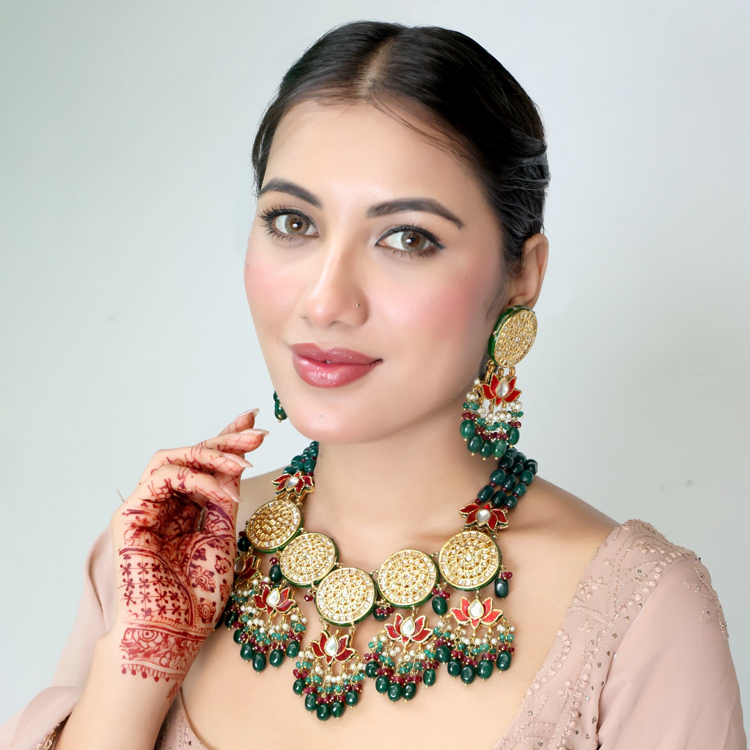 Make a statement of royal splendor with this Royal Lotus Kundan Necklace Set, featuring gold-finished circular kundan motifs adorned with green beads and red enamel lotus detailing. The intricate craftsmanship and color harmony bring out a luxurious festive radiance — perfect for weddings and grand occasions.