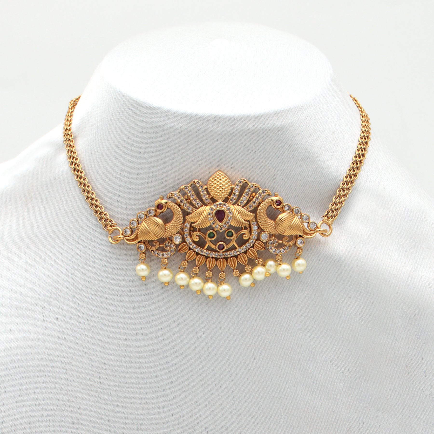 A regal temple-inspired choker featuring intricate motifs, antique gold detailing, and delicate pearl drops. The matching earrings add a graceful touch, making it a perfect blend of tradition and sophistication for special occasions.