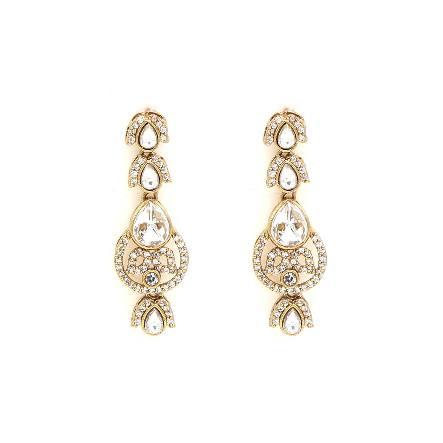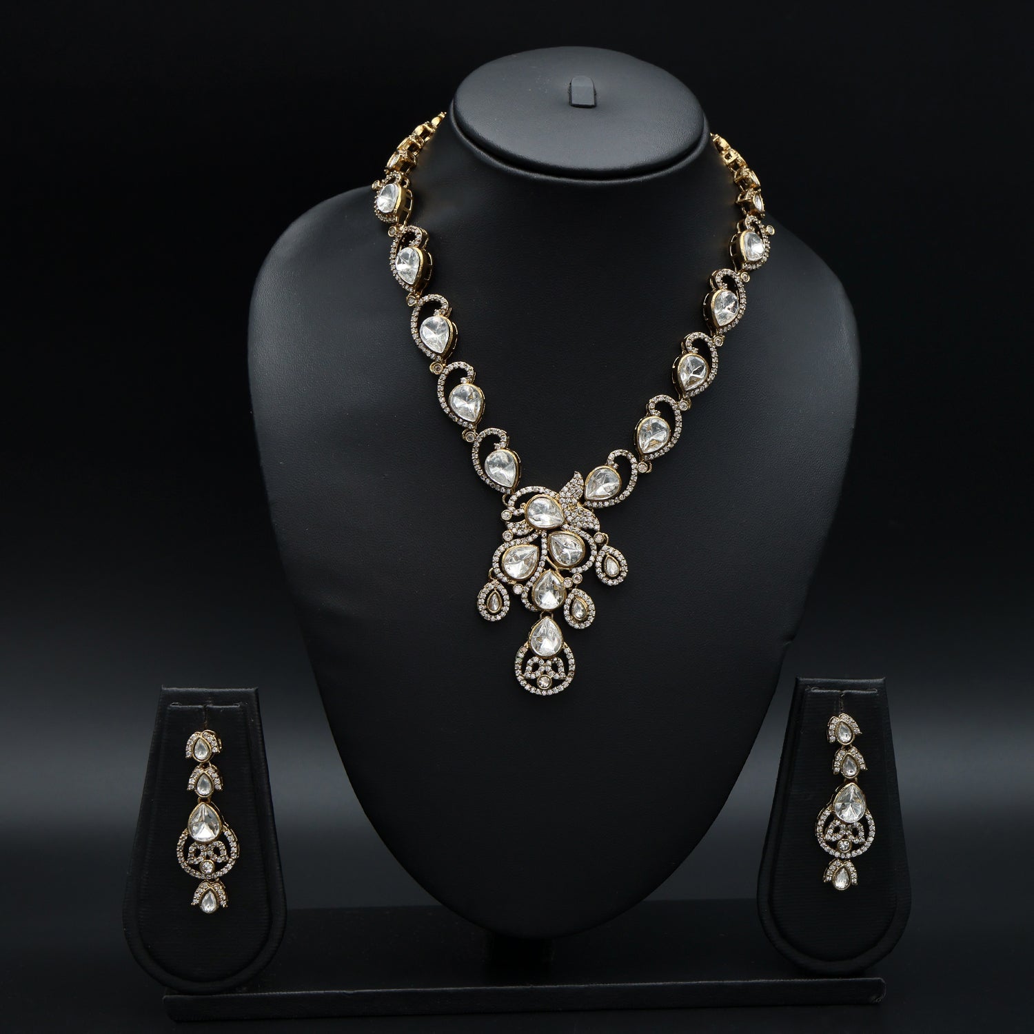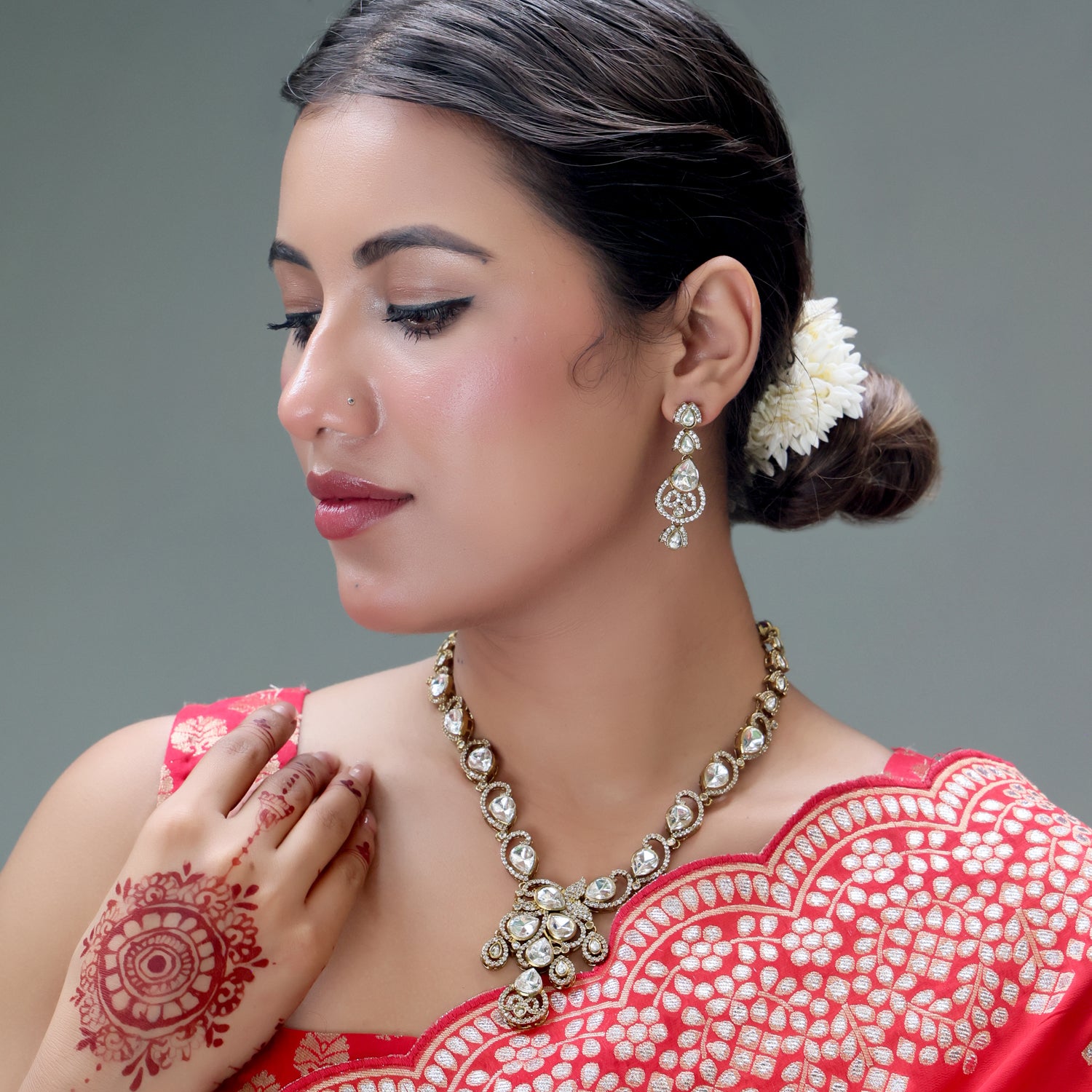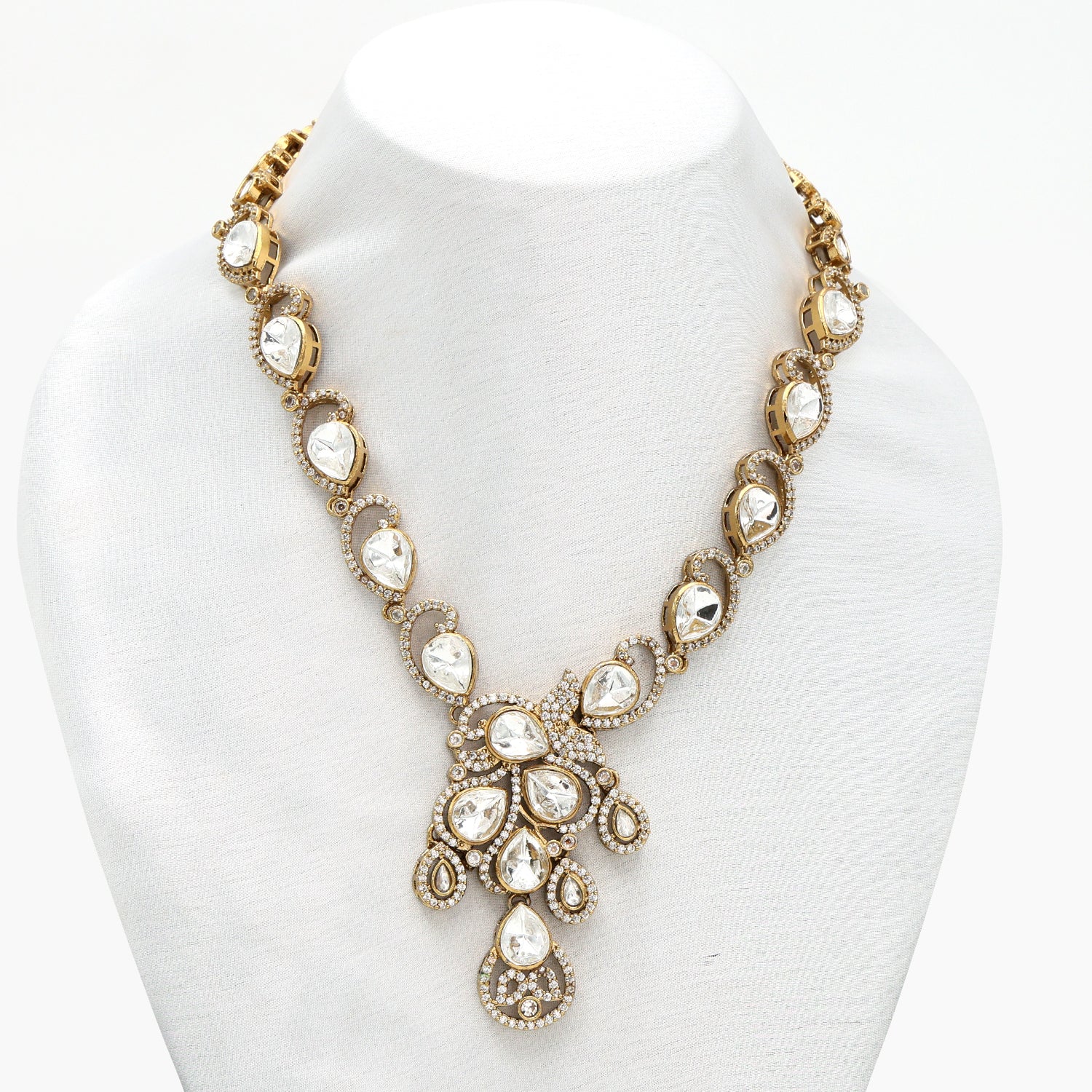 A regal handcrafted Polki Kundan necklace set featuring premium mirror-polish stones framed in intricate gold detailing. The cascading design adds a luxurious touch, while the matching earrings complete the traditional elegance. Perfect for grand Indian celebrations and bridal glow.