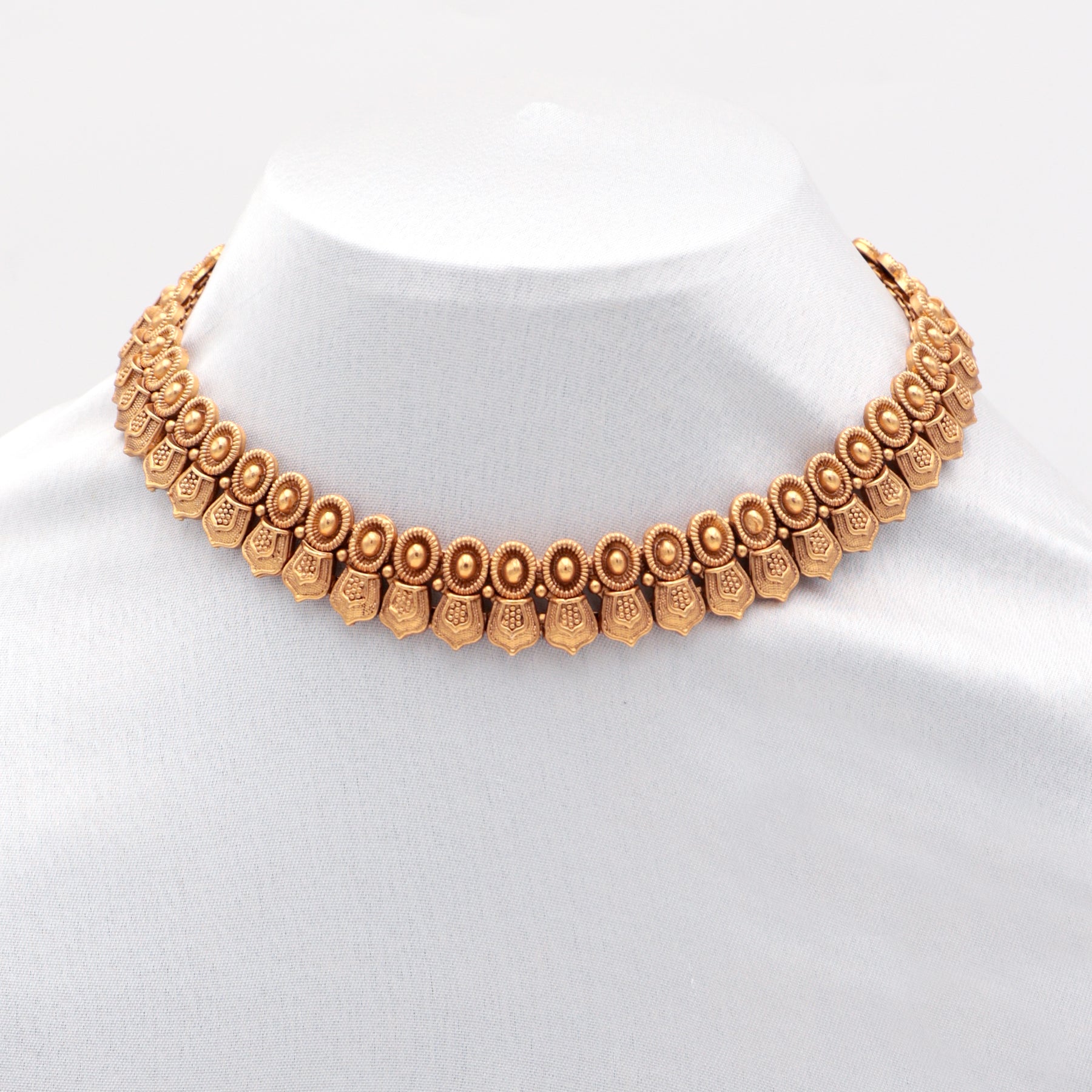 A timeless gold-tone choker inspired by traditional South Indian temple motifs. Its intricate circular detailing and matte finish bring a regal charm to any ethnic look. Lightweight yet statement-making, this choker set includes elegant matching studs for a graceful finish.