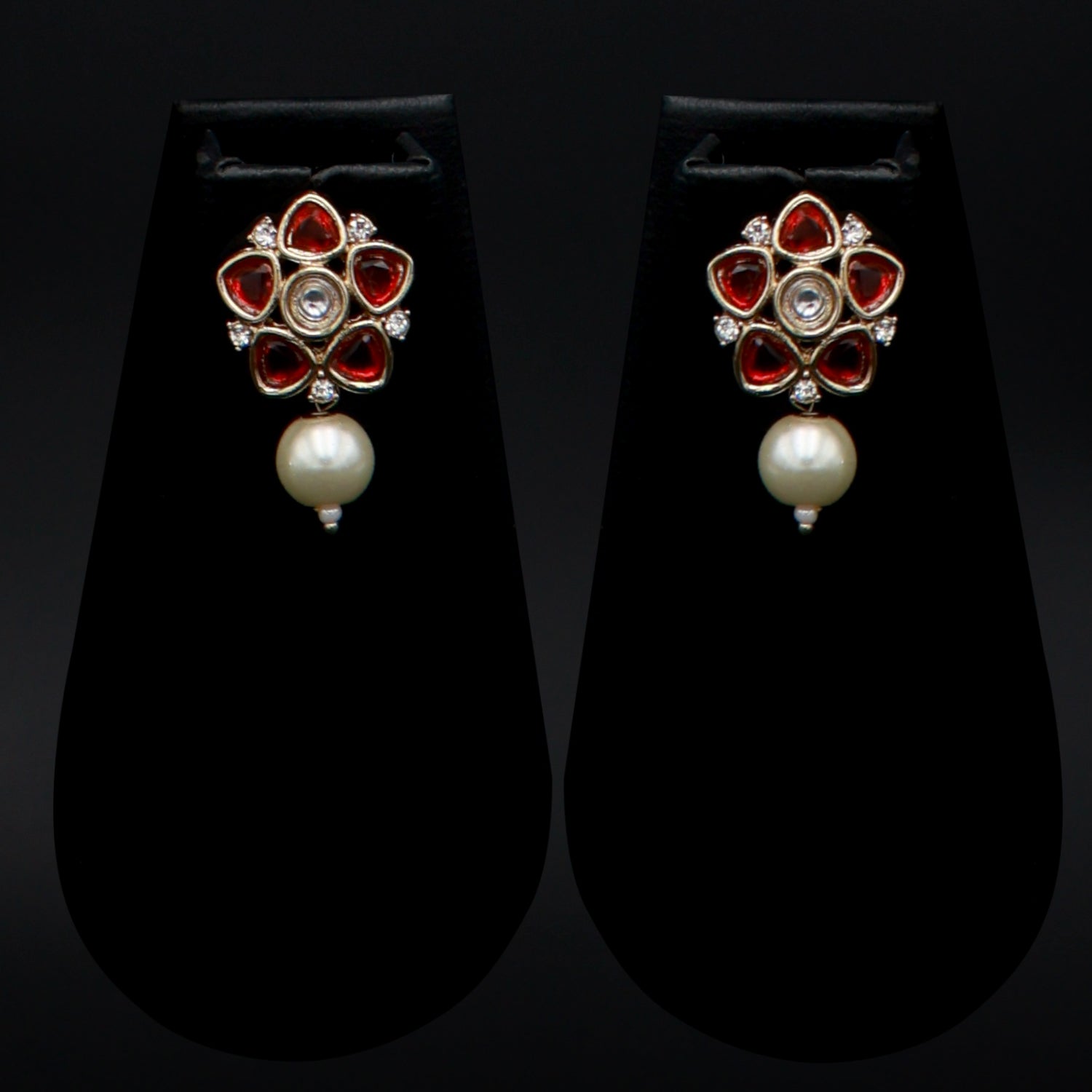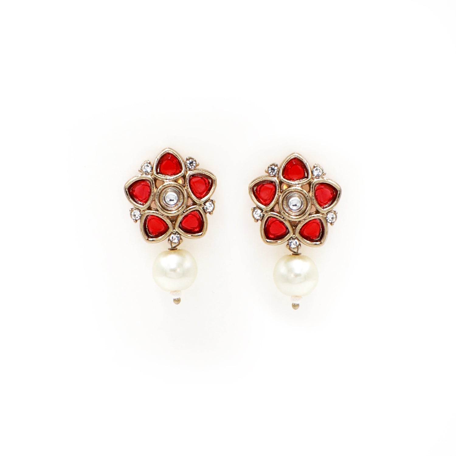 Polki Floral Stud Earrings with Pearl Drop - Red