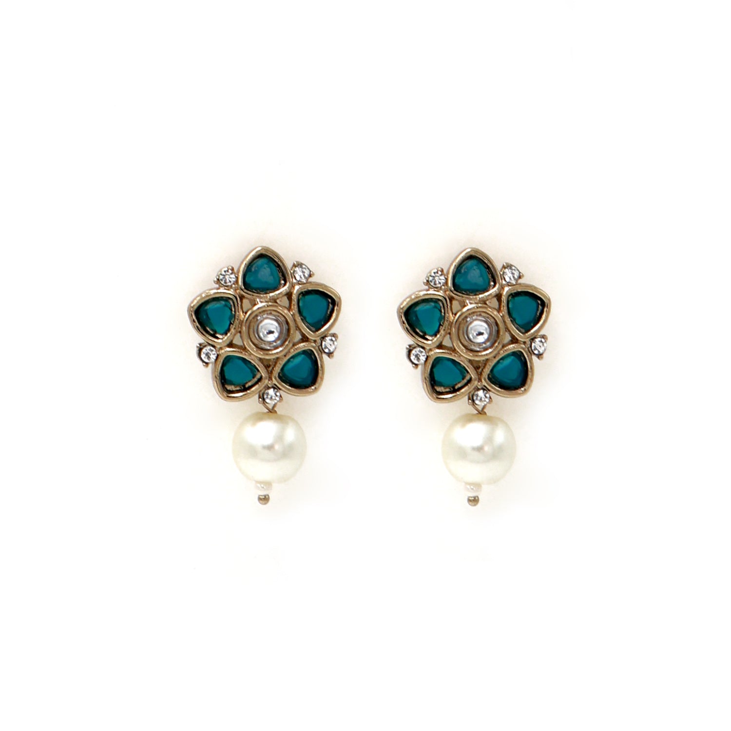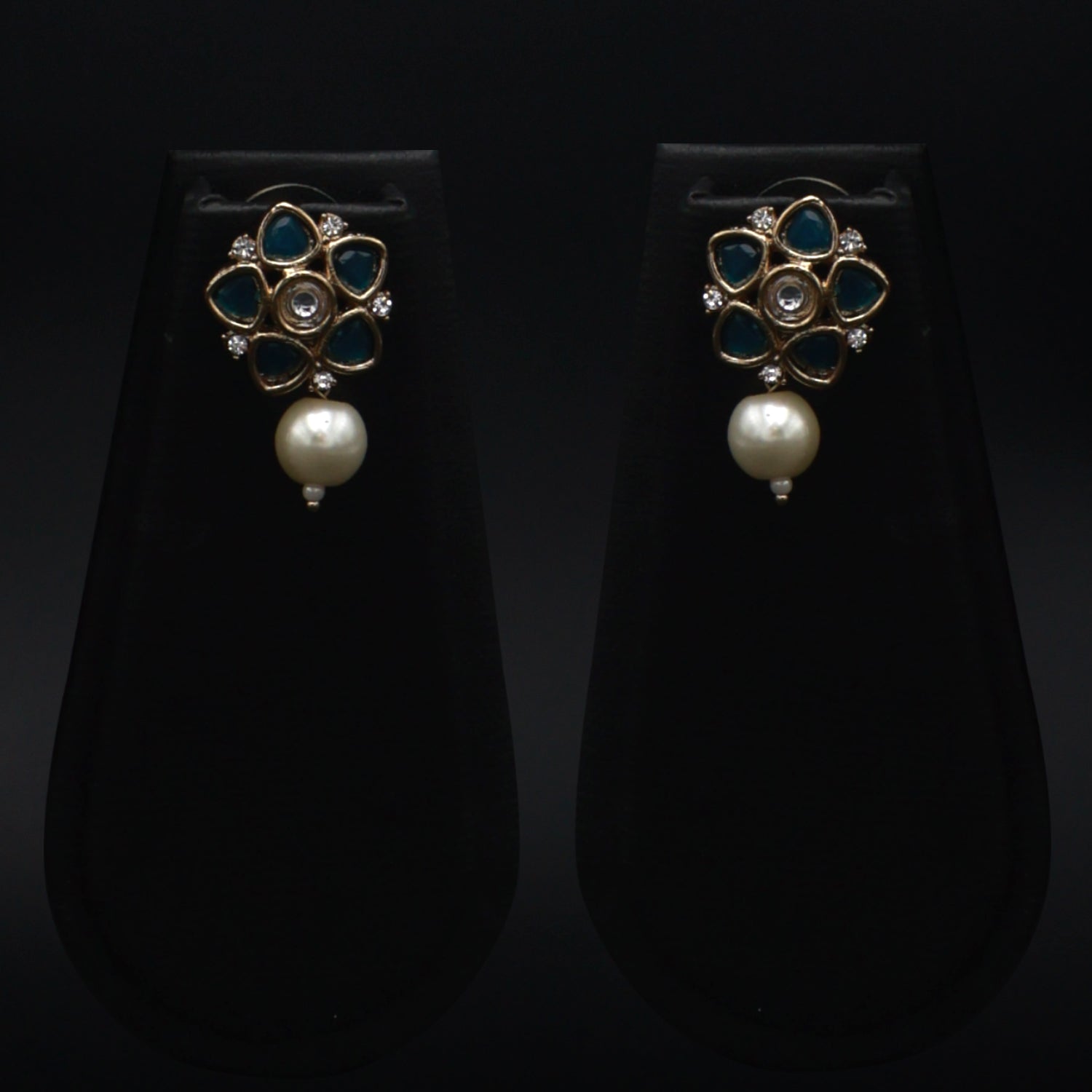 Polki Floral Stud Earrings with Pearl Drop - Sky Blue