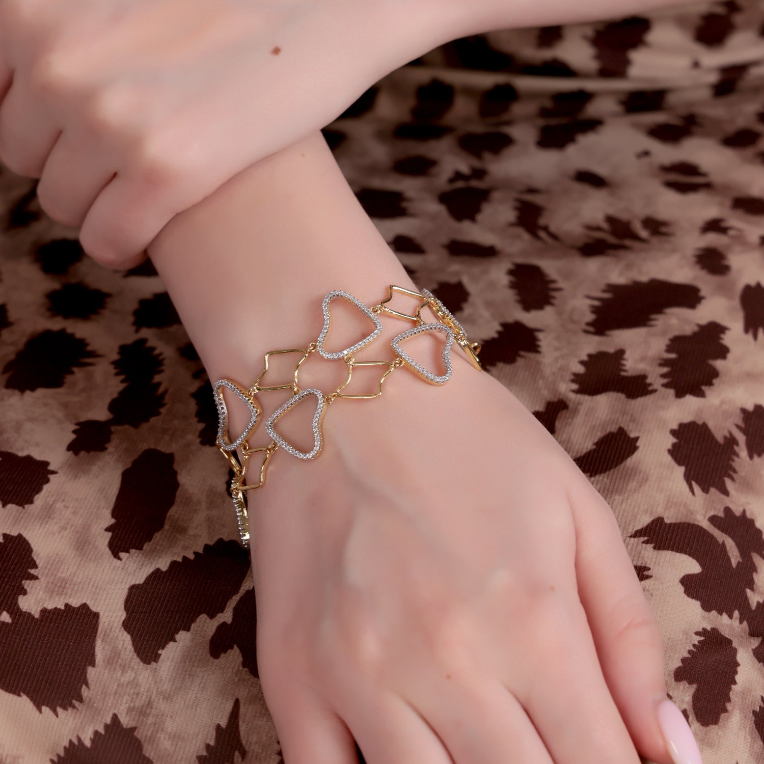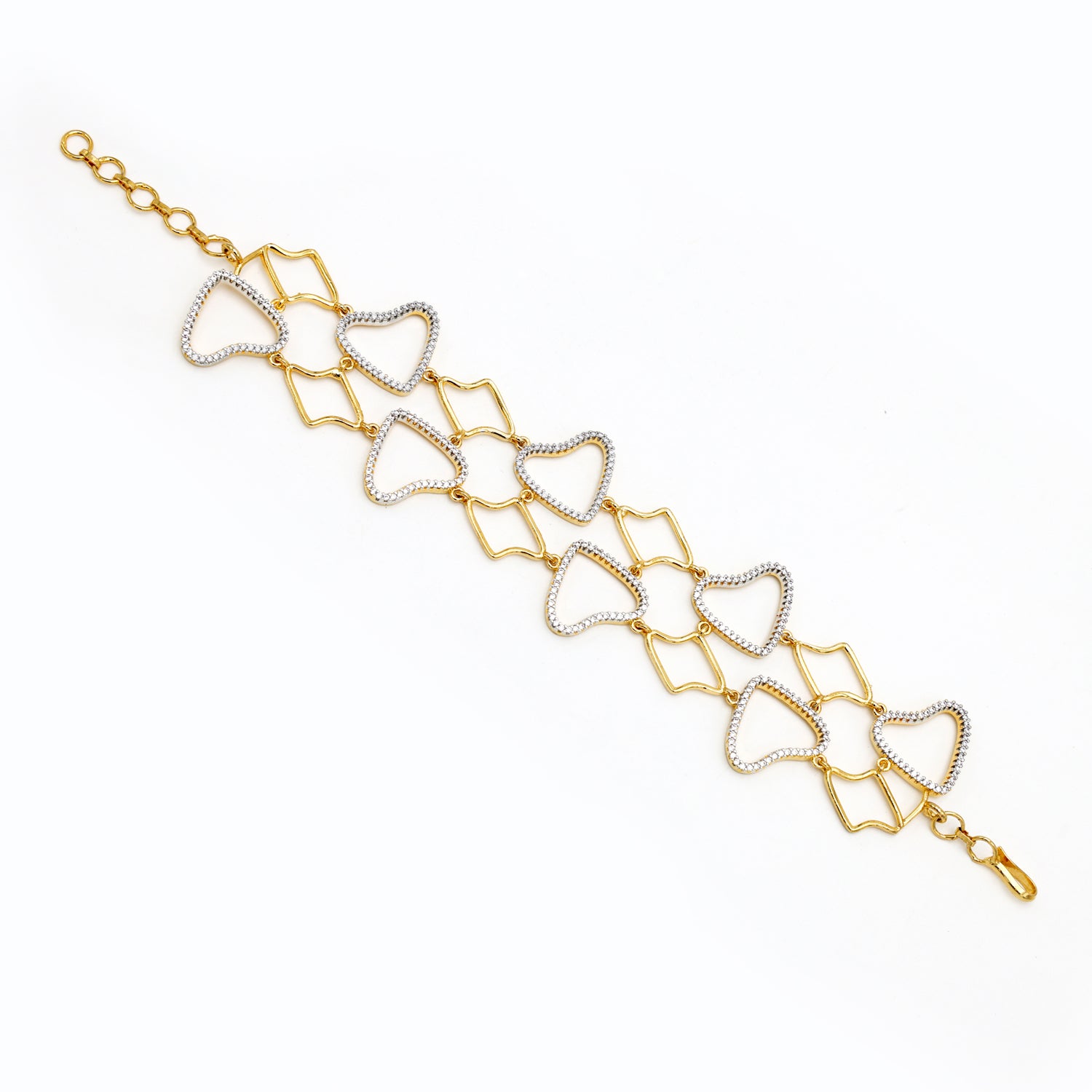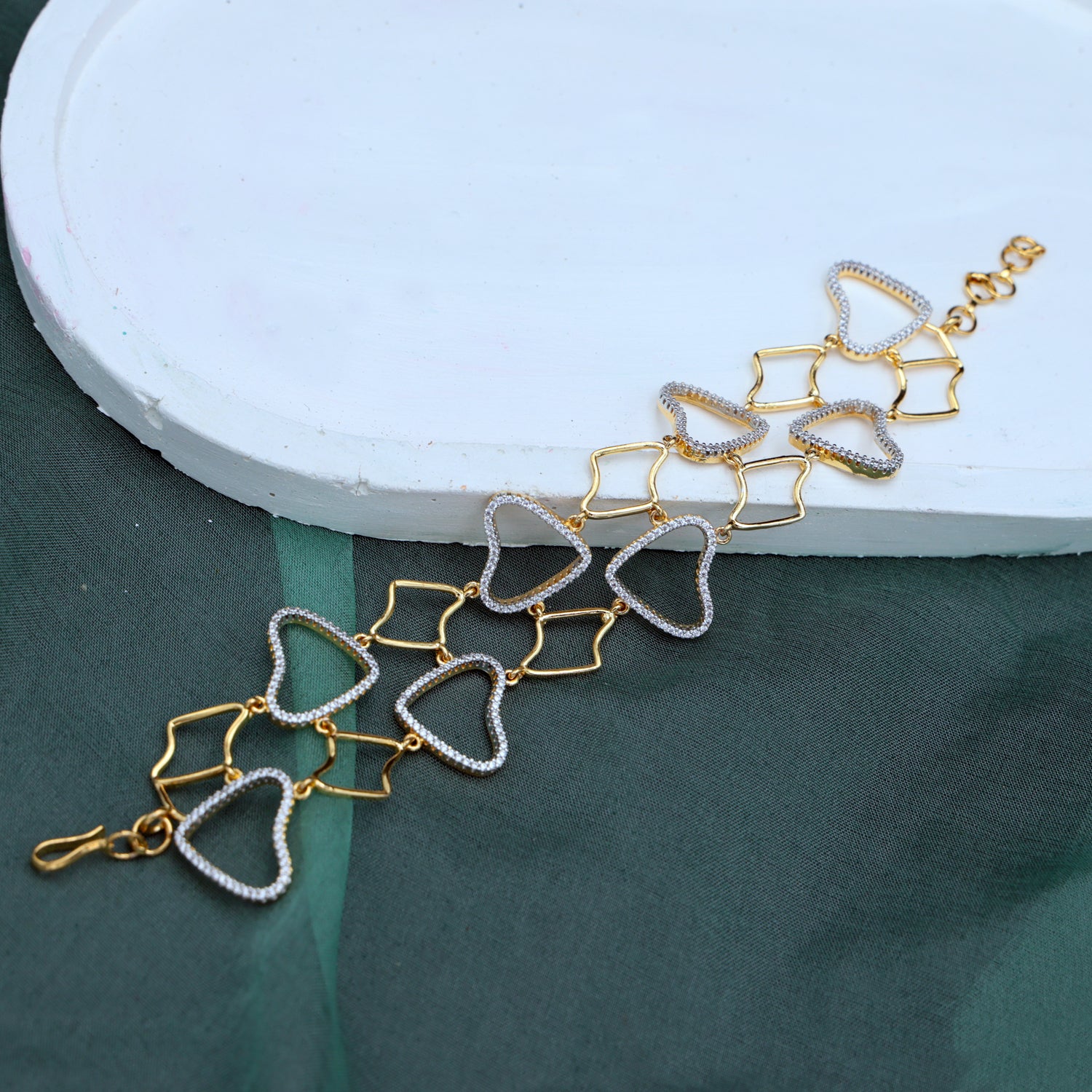 A romantic and refined bracelet featuring interlinked heart motifs outlined with shimmering stones in dual gold and silver tones. Elegant, lightweight, and versatile — this piece beautifully complements both Indian and Western ensembles.