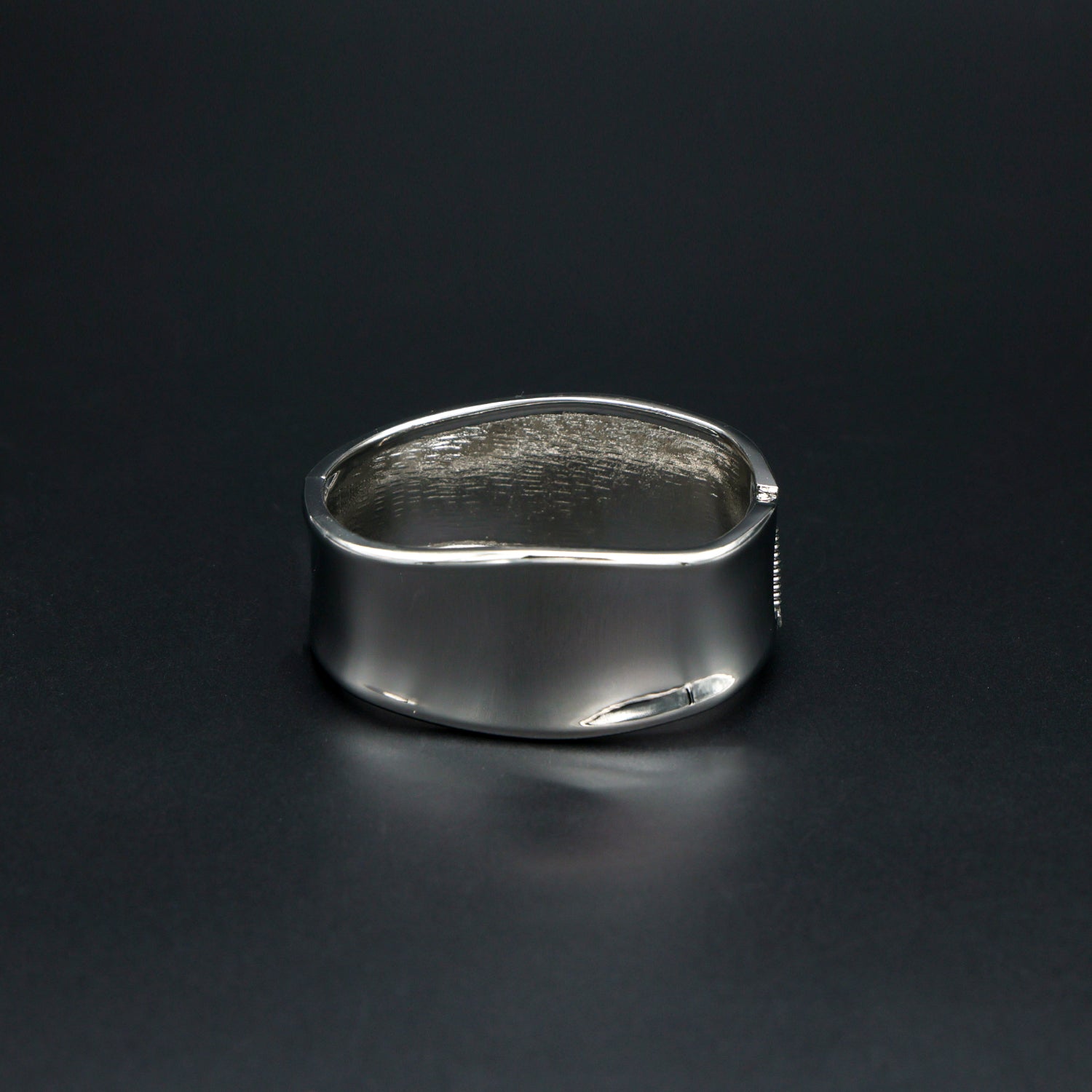 A bold metallic cuff in a smooth silver finish, designed with a fluid, curved silhouette. Its reflective shine and sleek form add a modern statement touch to any outfit — minimal, edgy, and elegant all at once.