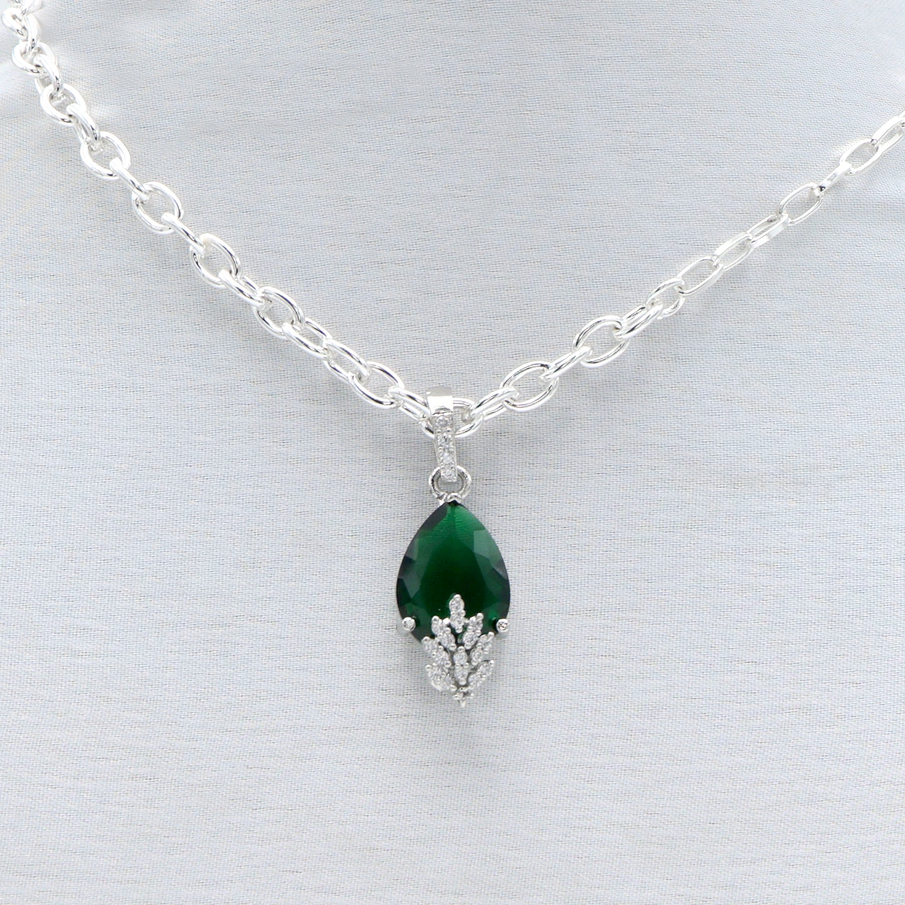 Silver Crystal Chain Necklace Set with Emerald Green Stones