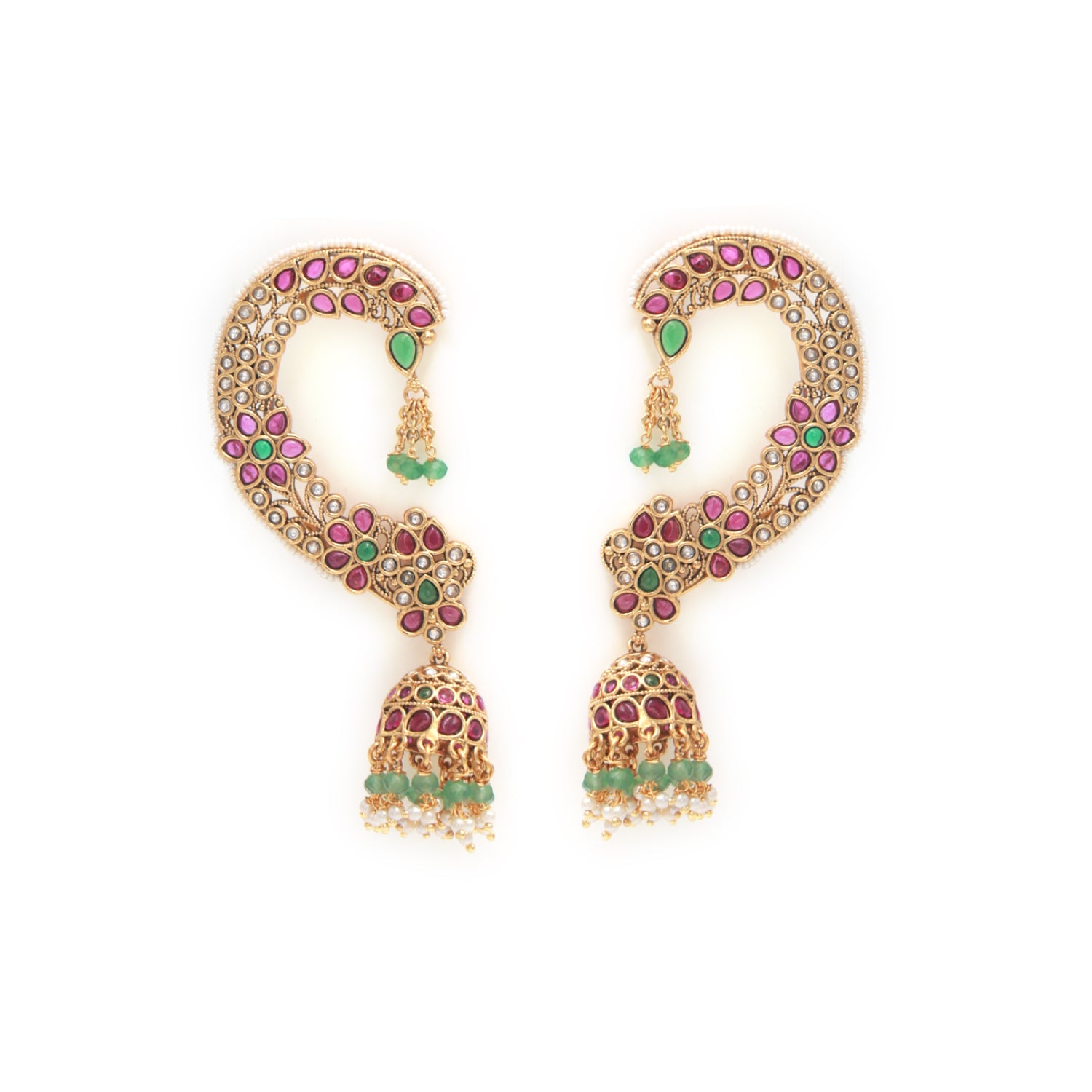 Royal Kundan Ear Cuff Jhumka – Ruby & Pearl Heritage Elegance by OLIARI - Ruby Green