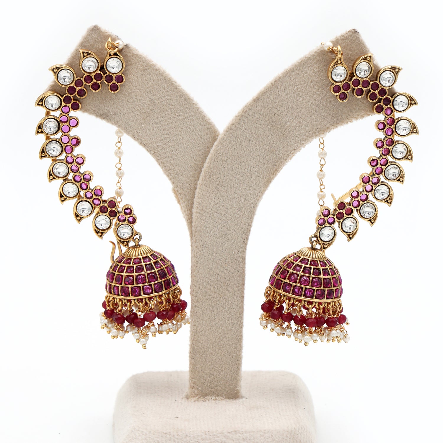 Step into regal elegance with this Ruby Jadau Ear Cuff Jhumka, designed to trace the ear beautifully while the handcrafted dome jhumka adds a traditional charm. Adorned with red stones, kundan detailing, and tiny pearls, it brings together heritage design and statement fashion — perfect for royal Indian looks.